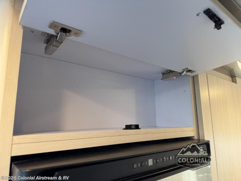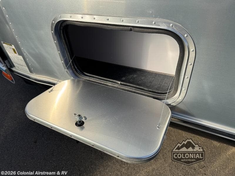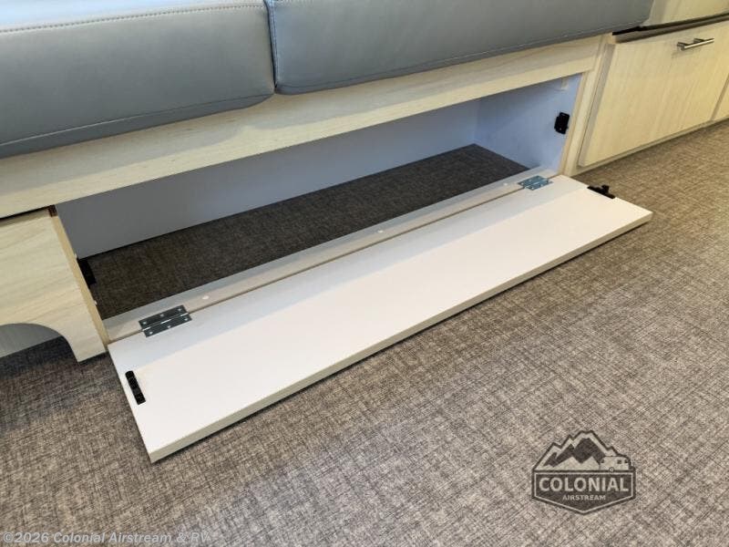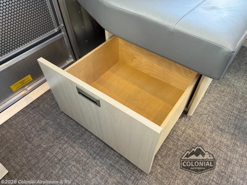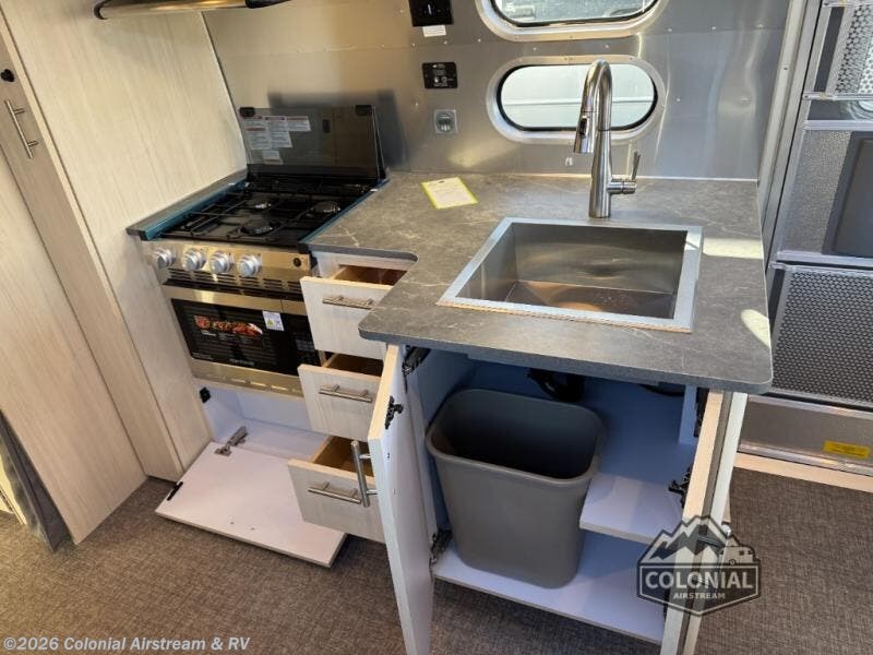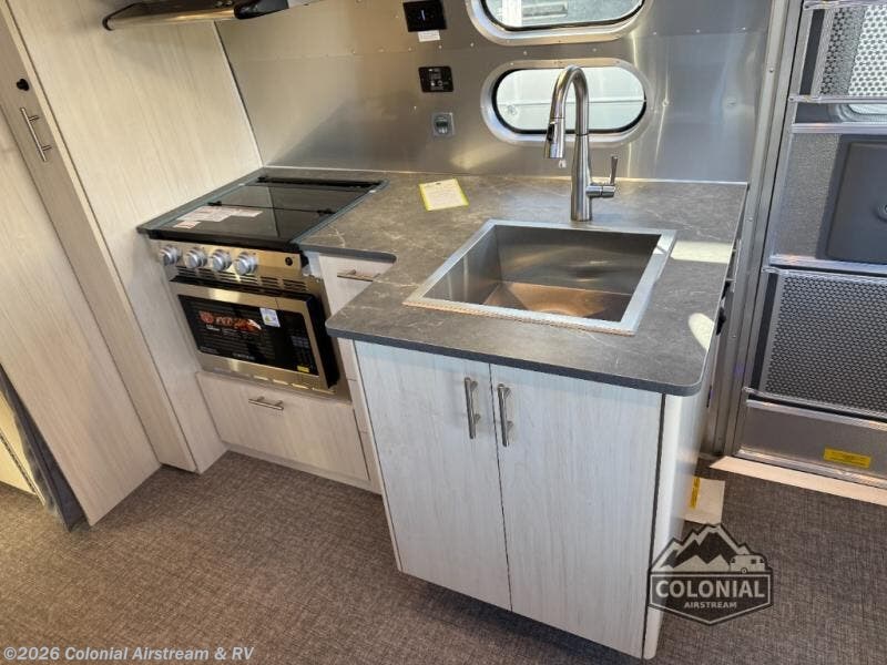 With each Flying Cloud travel trailer by Airstream, there are two axles, and each is built for ease of towing, plus there is a rear-view camera to make reversing and parking easier, and stainless-steel front stone guards to protect the lower segments from road debris. The iconic Airstream design is created outside and inside by the semi-monocoque aluminum superstructure, the temperature reducing one-piece white aluminum roof, the panoramic front windows, and the stylish aluminum wheels. The interior will have you feeling right at home with handcrafted cabinetry, plenty of storage and counter space, sleek roller blinds and blackout curtains, plus residential style faucets!