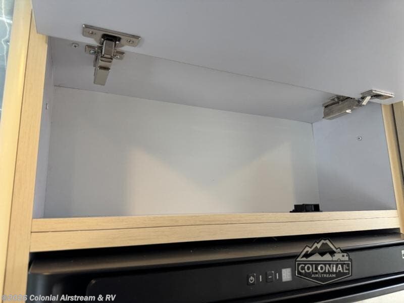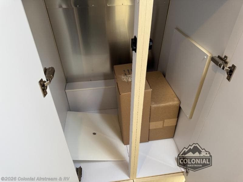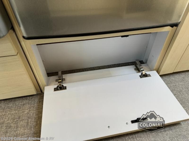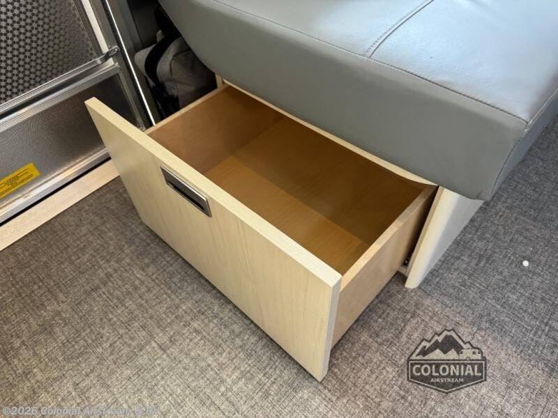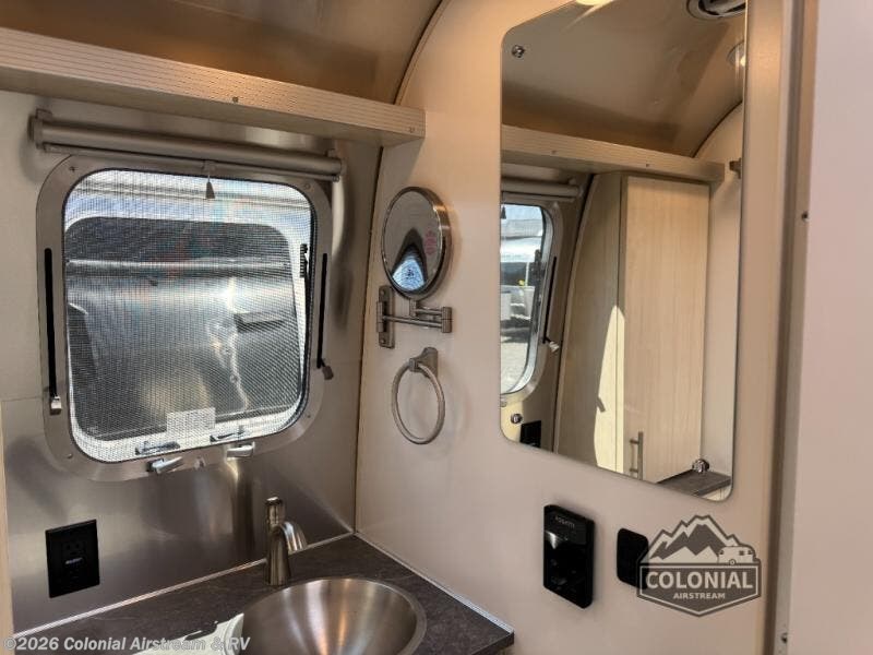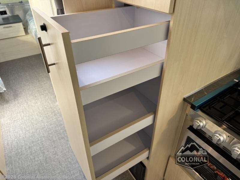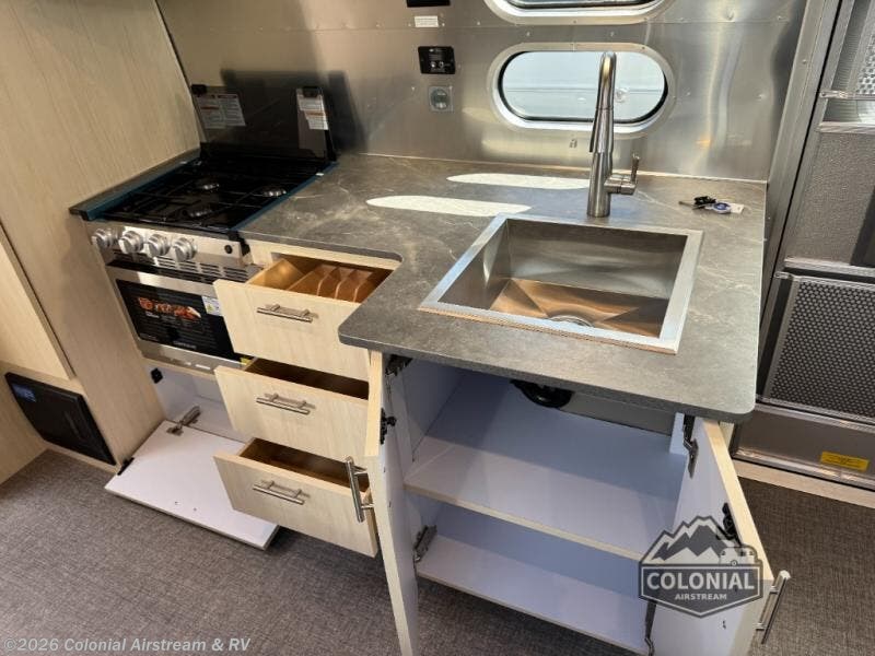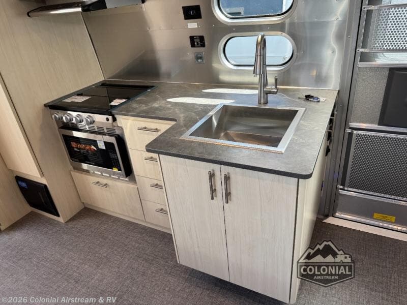 With each Flying Cloud travel trailer by Airstream, there are two axles, and each is built for ease of towing, plus there is a rear-view camera to make reversing and parking easier, and stainless-steel front stone guards to protect the lower segments from road debris. The iconic Airstream design is created outside and inside by the semi-monocoque aluminum superstructure, the temperature reducing one-piece white aluminum roof, the panoramic front windows, and the stylish aluminum wheels. The interior will have you feeling right at home with handcrafted cabinetry, plenty of storage and counter space, sleek roller blinds and blackout curtains, plus residential style faucets!