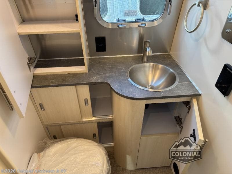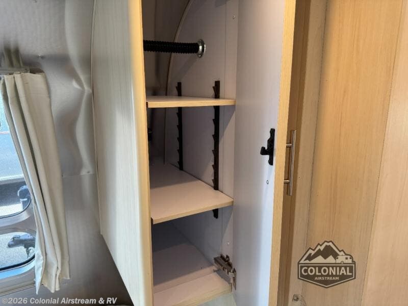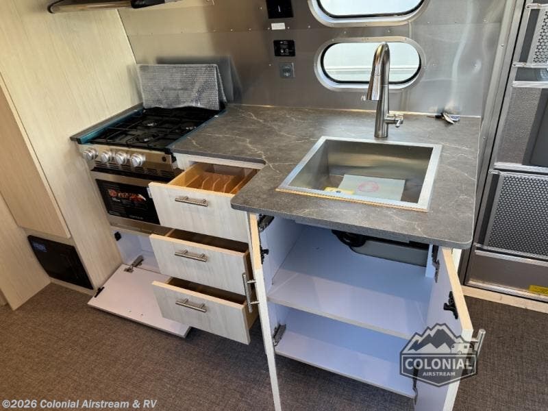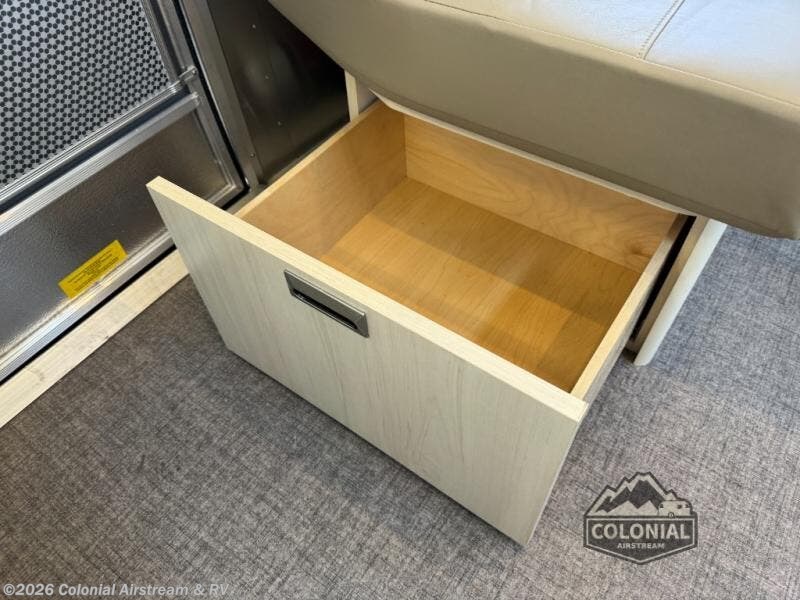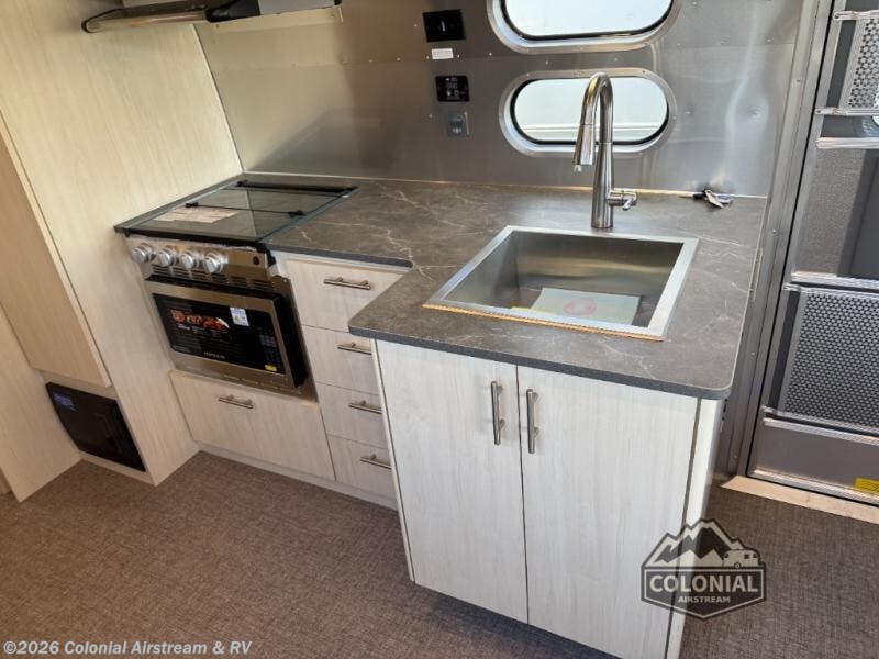 With each Flying Cloud travel trailer by Airstream, there are two axles, and each is built for ease of towing, plus there is a rear-view camera to make reversing and parking easier, and stainless-steel front stone guards to protect the lower segments from road debris. The iconic Airstream design is created outside and inside by the semi-monocoque aluminum superstructure, the temperature reducing one-piece white aluminum roof, the panoramic front windows, and the stylish aluminum wheels. The interior will have you feeling right at home with handcrafted cabinetry, plenty of storage and counter space, sleek roller blinds and blackout curtains, plus residential style faucets!