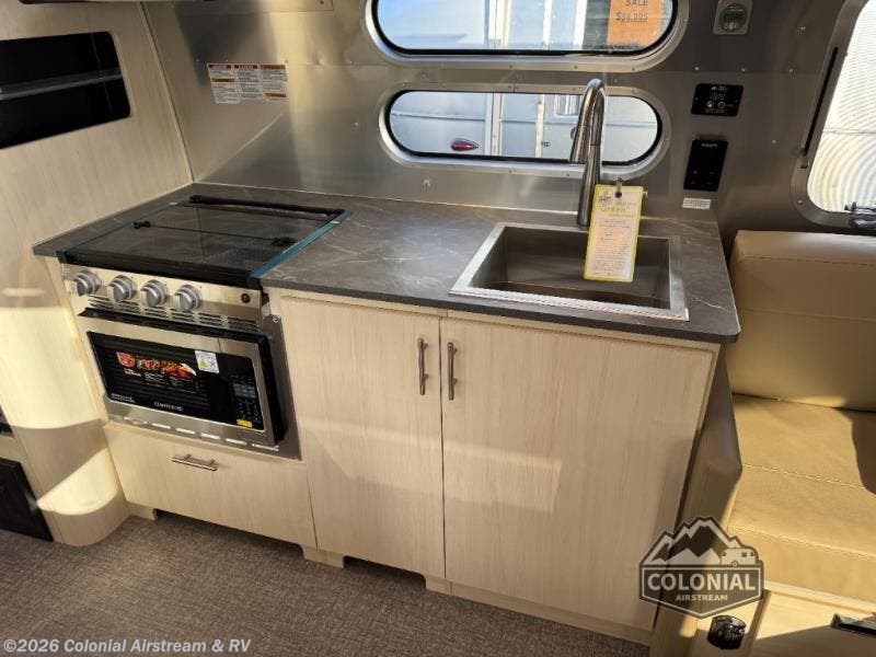 With each Flying Cloud travel trailer by Airstream, there are two axles, and each is built for ease of towing, plus there is a rear-view camera to make reversing and parking easier, and stainless-steel front stone guards to protect the lower segments from road debris. The iconic Airstream design is created outside and inside by the semi-monocoque aluminum superstructure, the temperature reducing one-piece white aluminum roof, the panoramic front windows, and the stylish aluminum wheels. The interior will have you feeling right at home with handcrafted cabinetry, plenty of storage and counter space, sleek roller blinds and blackout curtains, plus residential style faucets!