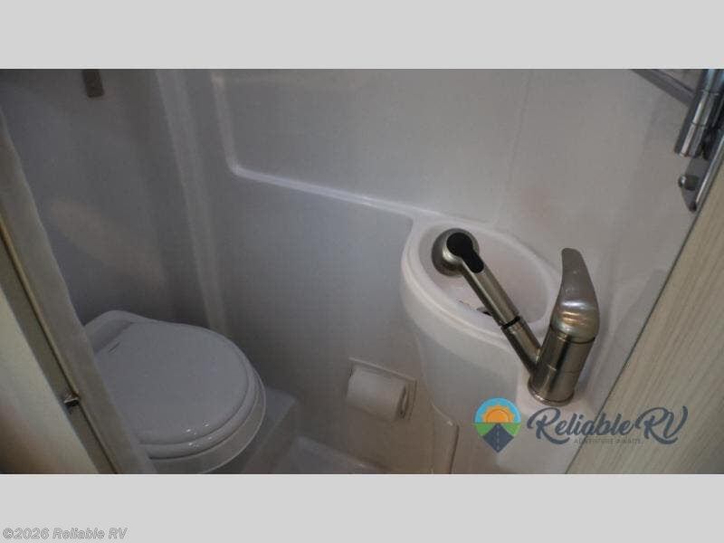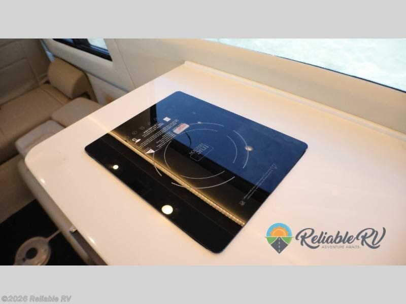 This motorhome is ready to take everyone to each destination in comfort and style! You can even stay overnight without booking a hotel room and stay squeaky clean with a wet bath that has a one-piece shower, a riveted aluminum porthole door, a toilet, a sink with an articulated mirror, a towel rack, and even a retractable clothesline. Keep your bellies full with the single-burner induction cooktop, the drawer-style microwave and the 3.1 cu. ft. refrigerator under the Corian counter. The rear power sofa is not only great for sitting on during the day, but also for sleeping on at night once it is folded down to turn the entire rear of the unit into a singular sleeping space. In between the two captain's chairs and the two side seats is a removable table to play games and eat meals!