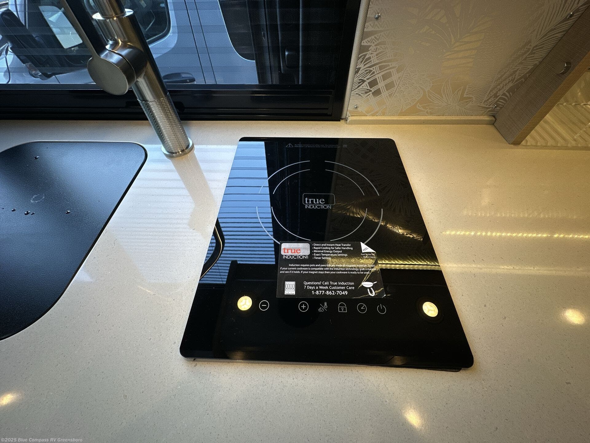 Get ready to drive and stay in comfort and luxury in this motorhome with everything you need and everything you didn't even know you wanted! The heated driver and passenger seats swivel to face the interior living space allowing you to utilize the Corian countertop with backsplash. Whip up a meal using the galley kitchen featuring a single-burner induction cooktop, and a sink and faucet, plus extra counter space for food prep. There is also a 1.2 cu. ft. drawer microwave, plus a pantry with built-in drawers and a refrigerator with a freezer across from the sink. The power sofa in the rear can be fully flat with a push of a button so two can sleep or rest. And there is storage throughout for your hanging clothes, towels, luggage, dishes and more.