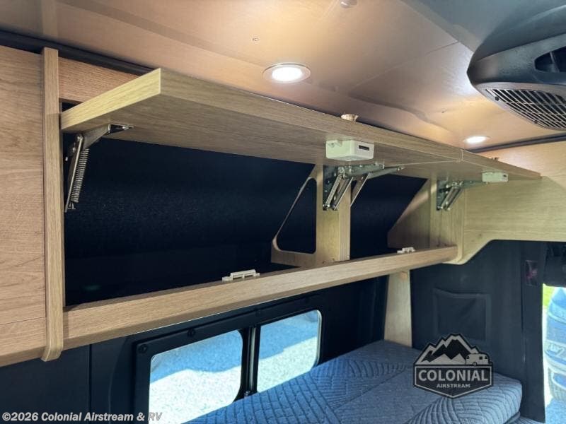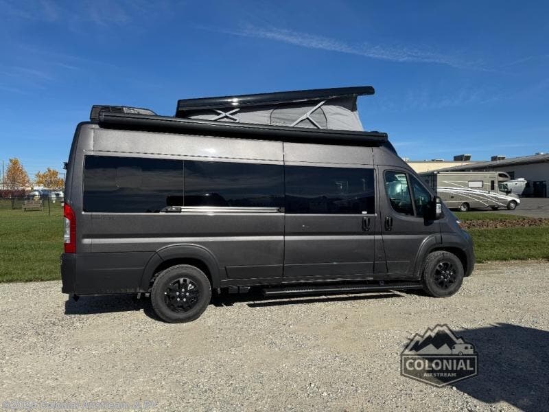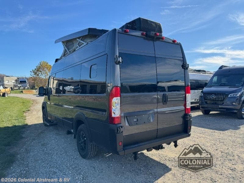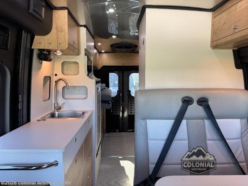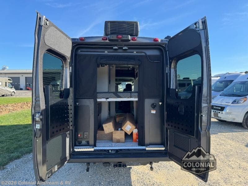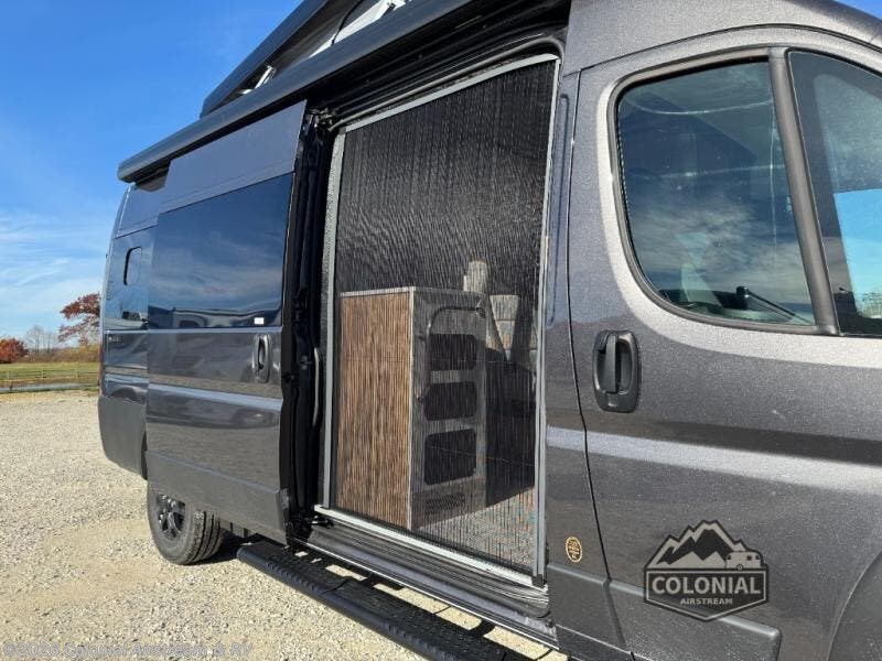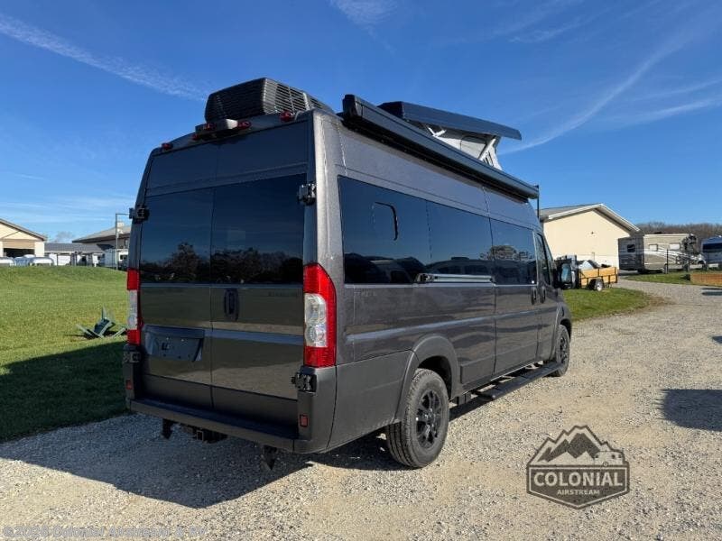 The Airstream Rangeline offers complete comfort and flexibility with great living spaces, flexible storage throughout, and all the amenities you need to enjoy travel. Its sleek design with painted grille, two interior color choices with Warm River Oak cabinets and drawers, and gray laminate countertops allows you to travel in style. The Ram ProMaster 3500 chassis offers front-wheel drive and 276 horsepower, with an efficient gas-powered heat and hot water system plus SumoSprings and SuperSprings for an overall better driving experience. Rear storage includes MOLLE panels on the rear doors to hang all your gear, and space under the bed for even more cargo. The optional pop-top roof has three screen windows and another bed, expanding sleeping capacity to four people.