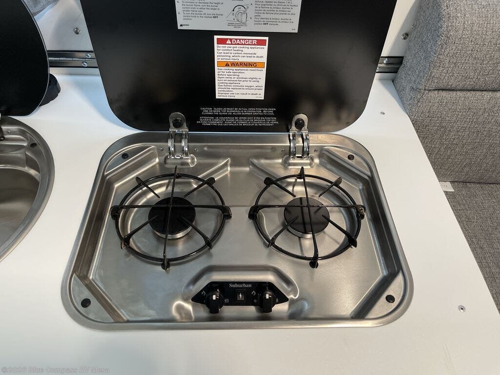 If you're looking for a lightweight camper that can sleep four, take a look at this Evolution 12! There is a sofa bed in the back that will convert to a 56" x 76" bed each night, and the shelves let you store your belongings. The dinette with bed conversion provides a place to dine each day, and a 46" x 76" bed at night. In the morning you can prepare breakfast on the two burner stove, clean up with the flush mount sink, and store cold items in the 3.0 cu. ft. 3-way refrigerator with a freezer. And you can even add an optional outside grill to keep fried food odors outdoors!