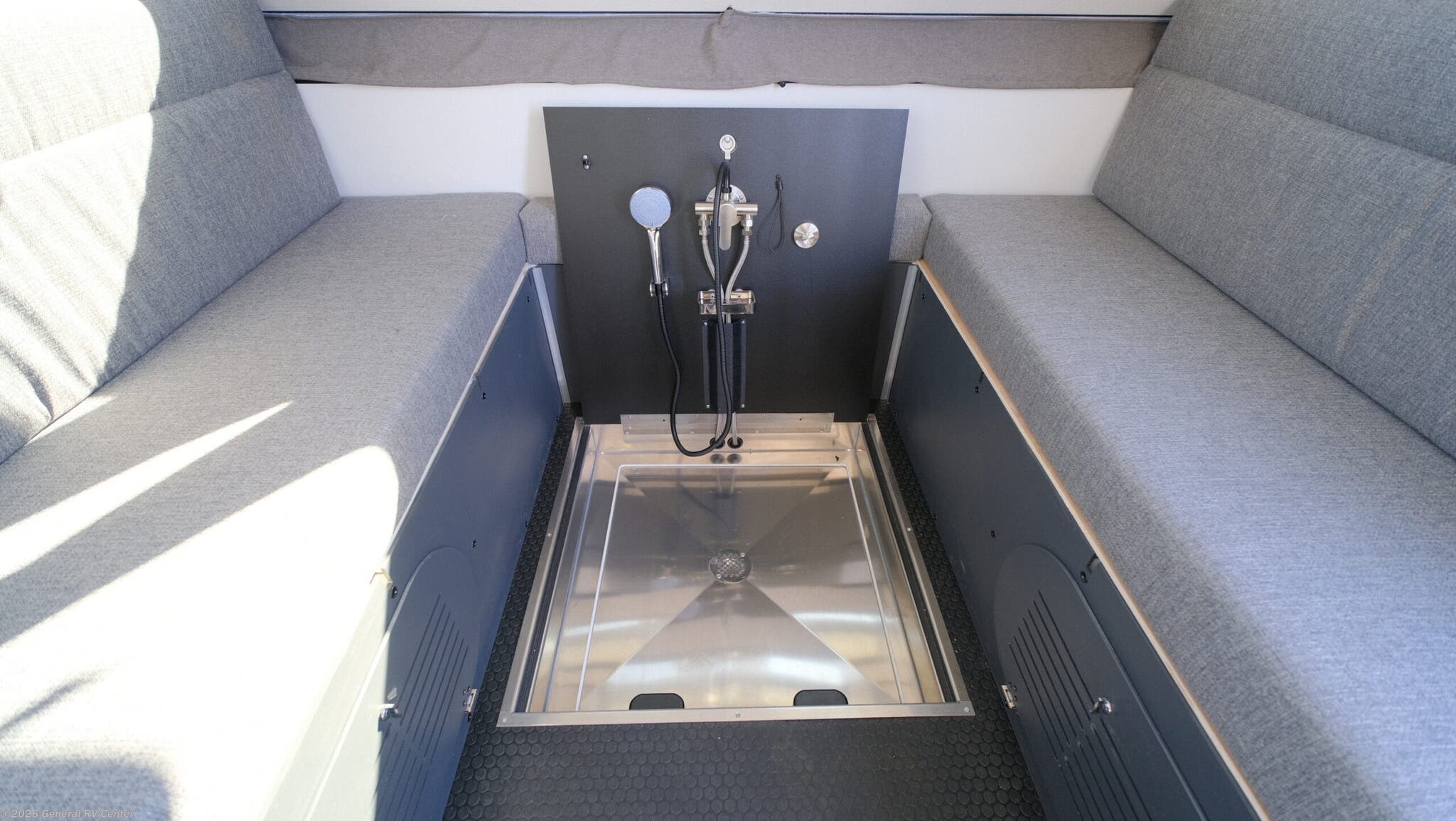 **Aliner Evolution A-Frame Evolution 15 highlights:** * Sofa Bed * Two Burner Cooktop * Hidden Shower * Cassette Toilet Don't wait another minute, head to the campground in this camper today! There is a two-burner cooktop to make lunch on and a 3.2 cu. ft. 12V refrigerator for your cold items. The sofa bed converts to a queen-size bed, and the dinette also converts to a queen-size bed. You'll find storage space for your items, and there is a 32" x 32" hidden shower under the dinette so you can clean up each day. This model also has a dry weight of 2,400 lbs. for easy towing! The Evolution A-frame camper by Aliner is coming to you with residential features and solid construction materials. You'll love the slate gray exterior, aluminum wheels, and the Azdel composite panels to help prolong the life of your camper. There are LED running lights, exterior baggage doors, and four stabilizer jacks to help keep your camper secure. You will also appreciate the keyless entry, the dual LP tanks with a cover, and the 200-watt solar panel on the front dormer for some off-grid power. The lift kit and 15" off-road tires add 3" to the height, allowing you to explore more roads, and you'll find many interior comforts to make you feel right at home!
