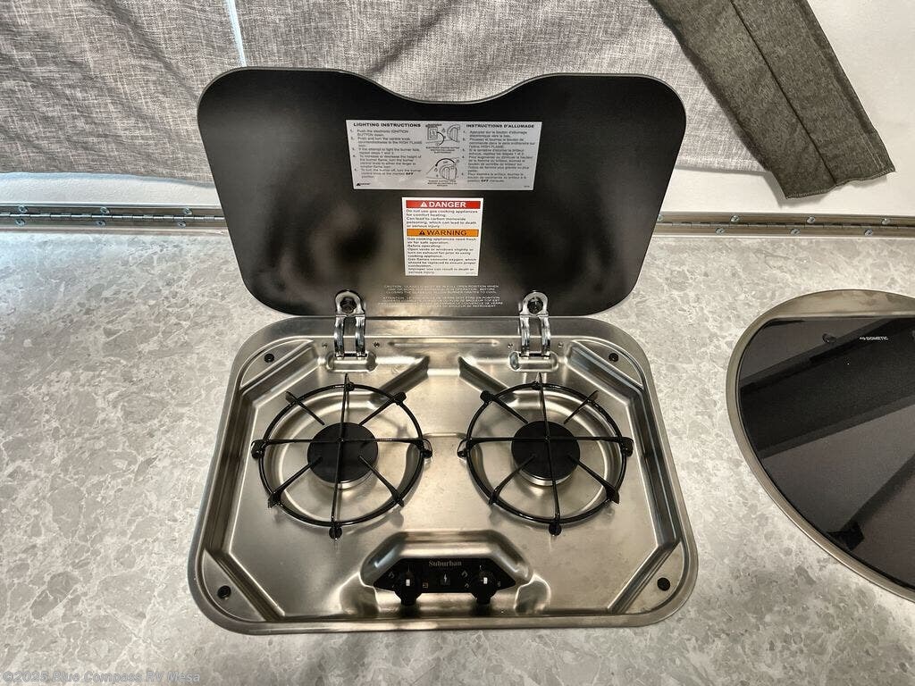 Versatile, comfortable, and convenient indoor living while camping can be found throughout this camper! The shower with a cassette toilet offers convenience and a place to clean up each morning, the 3.1 cu. ft. 12V refrigerator offers cold storage, and the microwave plus two burner stove allows you to make warm meals. Eat your meals while sitting on the sofa bed or at the dinette with two seats. And the sofa bed converts into an 74" x 76" bed for a great night's rest!
