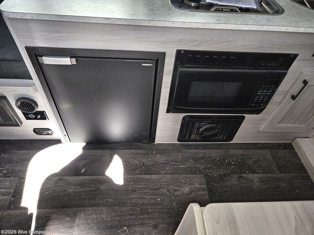 Versatile, comfortable, and convenient indoor living while camping can be found throughout this camper! The shower with a cassette toilet offers convenience and a place to clean up each morning, the 3.2 cu. ft. 12V refrigerator offers cold storage, and the microwave plus two burner stove allows you to make warm meals. Eat your meals while sitting on the sofa bed or at the dinette with two seats. And the sofa bed converts into an 74" x 76" bed for a great night's rest!