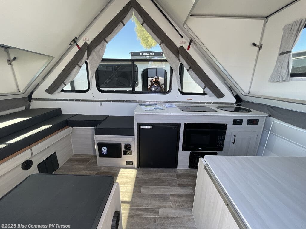 Versatile, comfortable, and convenient indoor living while camping can be found throughout this camper! The shower with a cassette toilet offers convenience and a place to clean up each morning, the 3.1 cu. ft. 12V refrigerator offers cold storage, and the microwave plus two burner stove allows you to make warm meals. Eat your meals while sitting on the sofa bed or at the dinette with two seats. And the sofa bed converts into an 74" x 76" bed for a great night's rest!