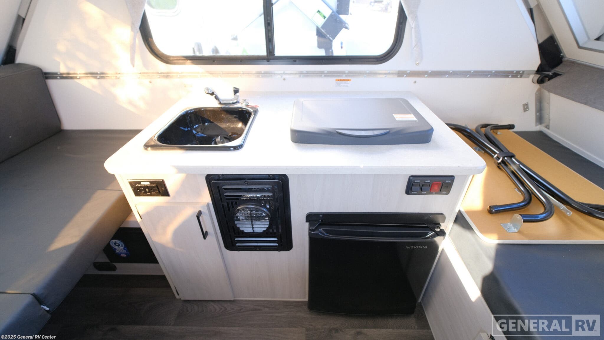 Aliner Ranger A-frame camper 10 Dual Bed highlights: Front 30" x 76" Bed Rear Dinette Outside Shower One Exterior Bag Door 14" Tires Whether you camp solo or with your friend, you will have all the accommodations you need to enjoy the outdoors, and sleep as well as cook indoors! The front 30" x 76" bed or the rear dinette that can be converted into a 40" x 76" bed give you choices each night. You will appreciate the storage under the bed and the extra storage area across from the kitchen. There is a two burner stove to make a warm meal, a sink to wash your dishes, and a 1.7 cu. ft. 12V refrigerator for your perishables. And don't forget to charge your cellphone using one of the interior or exterior outlets. With any Ranger A-frame camper by Aliner, the construction includes Azdel composite roof/sidewalls for added durability, plus a Dexter rubber torsion axle for smooth towing. Inside, there is high density foam, hypoallergenic cushions and mattresses, a 12 Volt refrigerator, electrical outlets, and LED lights to keep your space well lit. You are sure to appreciate the high wind lift assist, dual tanks with a cover, and the furnace to keep you warm during the cooler camping months.