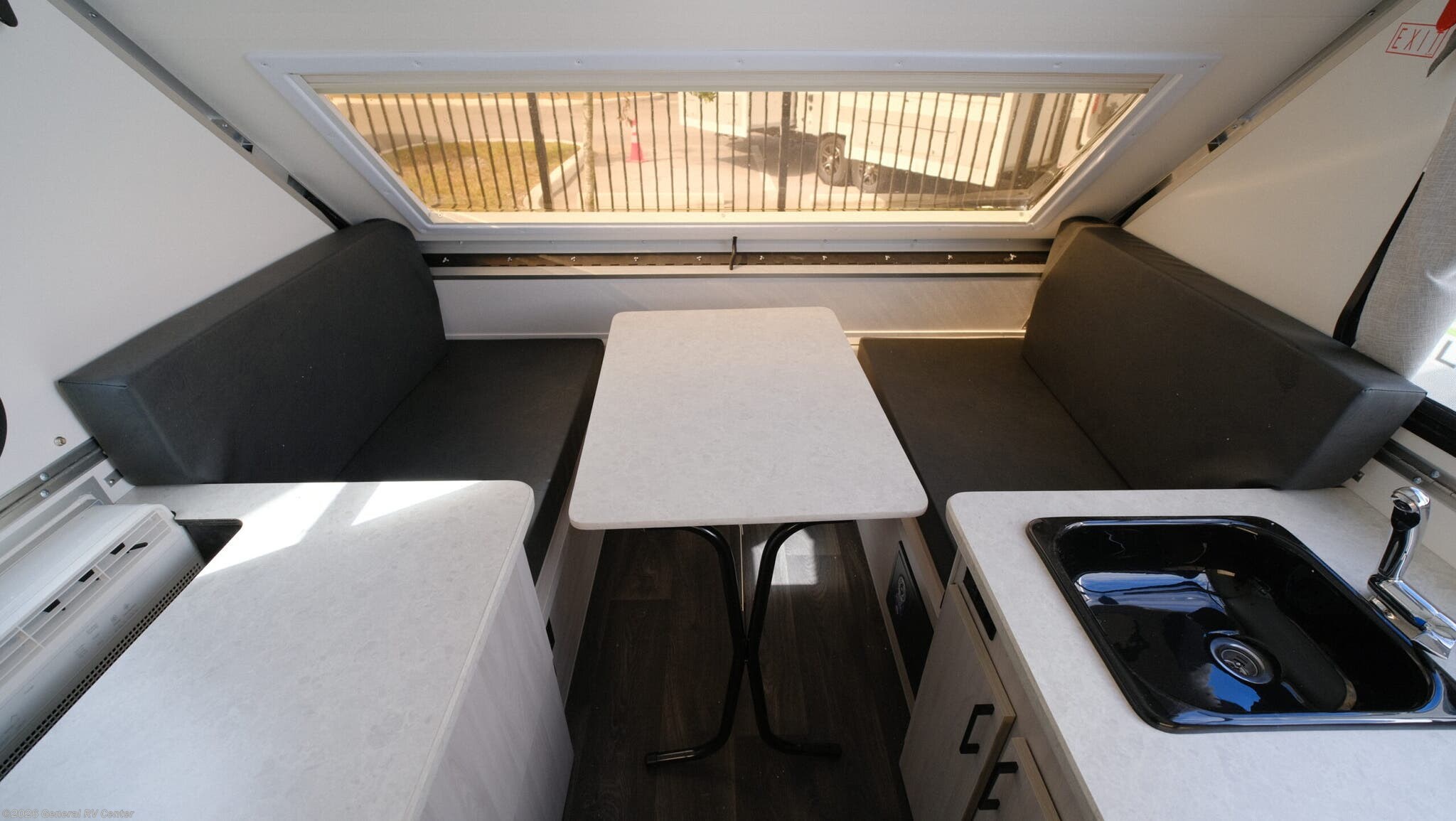 **Aliner Scout Lite A-frame camper Base Model highlights:** * 30" x 76" Front Bed * Rear Dinette * Sink * Exterior Bag Door When all you need is the basics to camp, this Scout Lite will be perfect for you! There is sleeping space on either the front 30" x 76" bed or the rear dinette which converts into a 40" x 76" bed. There is plenty of storage throughout between the storage under the front bed, under the sink, and the exterior baggage door. And you can keep everything charged with the two electrical outlets inside and the one exterior electrical outlet! With the Scout Lite A-frame camper by Aliner, the construction includes Azdel composite roof/sidewalls, aluminum wheels, and a 5" tubular steel frame for added durability. The 1,190 lbs. dry weight will make it easier than ever to tow, and the four stabilizer jacks will help keep your camper secure at the campground.