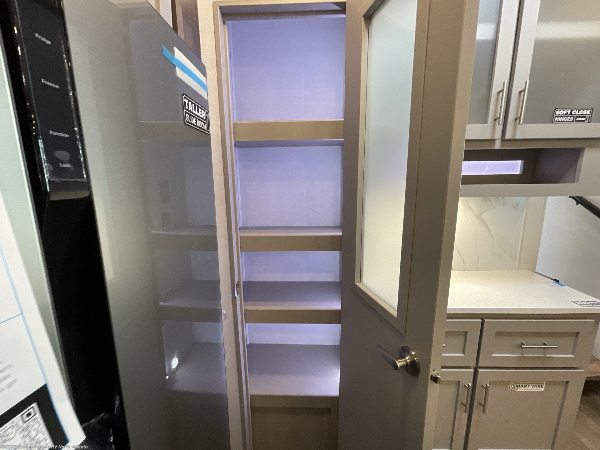 A kitchen island with countertop space makes it easy to prepare meals in this fifth wheel! The floating dinette table has two chairs on one side and a movable ottoman with flip up storage on the other side to keep your games or extra table cloths in. You can store your dishes and snacks inside the hutch/pantry or in the second pantry. The front private bedroom has a queen bed slide but can be switched out for the optional king bed if you like. There is also a dresser and large wardrobe for storage, and either side of the wardrobe with washer and dryer prep. The rear living area features a dual recliner theater seat across from an entertainment center with a 50" class HDTV with hidden storage behind it, and is also on a swing mount for all to see even at the rear sleeper sofa!