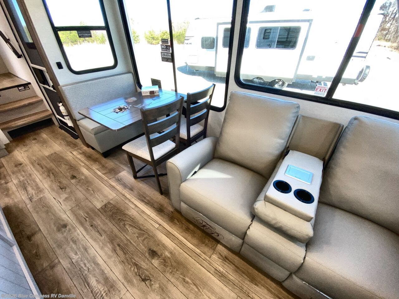 A kitchen island with countertop space makes it easy to prepare meals in this fifth wheel! The floating dinette table has two chairs on one side and a movable ottoman with flip up storage on the other side to keep your games or extra table cloths in. You can store your dishes and snacks inside the hutch/pantry or in the second pantry. The front private bedroom has a queen bed slide but can be switched out for the optional king bed if you like. There is also a dresser and large wardrobe for storage, and either side of the wardrobe with washer and dryer prep. The rear living area features a dual recliner theater seat across from an entertainment center with a 50" class HDTV with hidden storage behind it, and is also on a swing mount for all to see even at the rear sleeper sofa!
