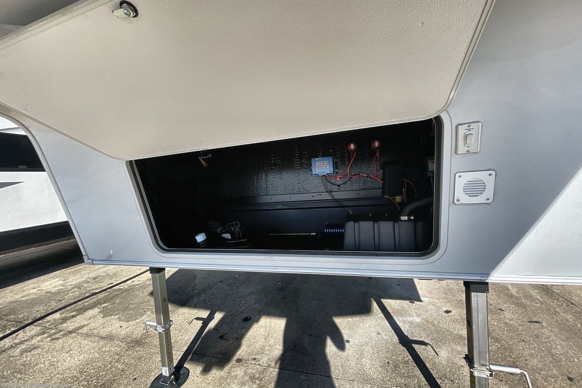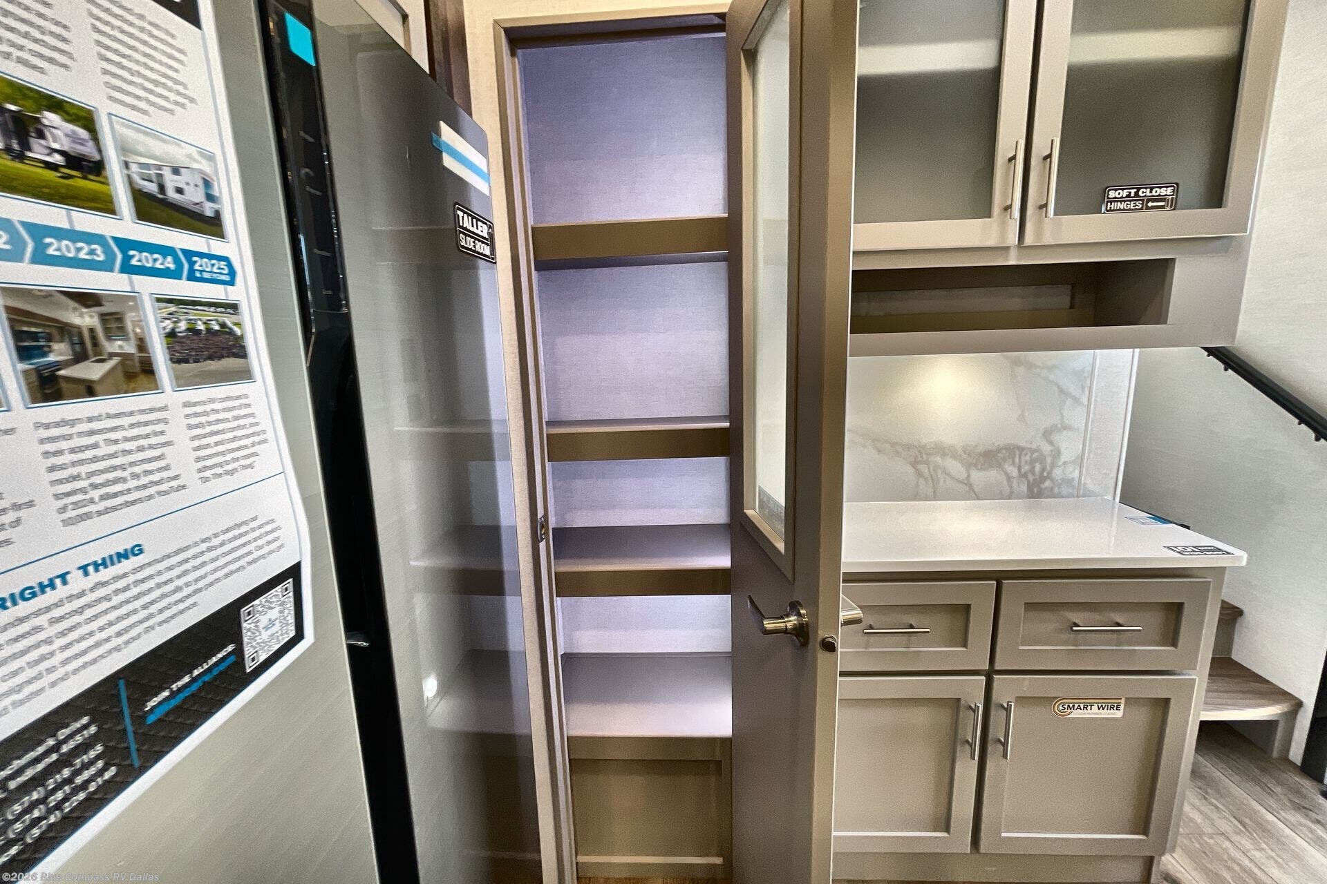 A kitchen island with countertop space makes it easy to prepare meals in this fifth wheel! The floating dinette table has two chairs on one side and a movable ottoman with flip up storage on the other side to keep your games or extra table cloths in. You can store your dishes and snacks inside the hutch/pantry or in the second pantry. The front private bedroom has a queen bed slide but can be switched out for the optional king bed if you like. There is also a dresser and large wardrobe for storage, and either side of the wardrobe with washer and dryer prep. The rear living area features a dual recliner theater seat across from an entertainment center with a 50" class HDTV with hidden storage behind it, and is also on a swing mount for all to see even at the rear sleeper sofa!