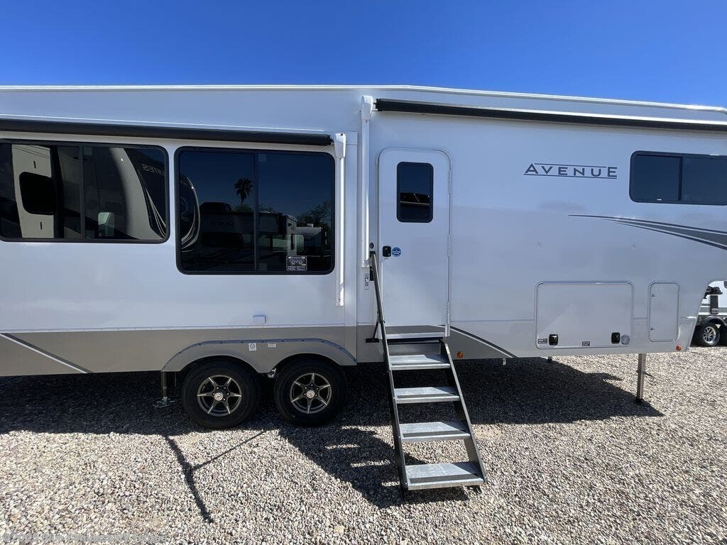 With any Avenue fifth wheel or travel trailer by Alliance RV, you will enjoy more interior space provided by the 8' 5" wide-body construction, and a long list of luxury features. Each is built with Azdel composite sidewalls both inside and out, along with a PVC roof for added strength. There are innovative storage solutions that include hidden storage behind the TV, within end tables and ottomans, and more. Since these units feature no carpet throughout, cleaning will be easier than ever, and there are flush floor slides throughout for seamless living spaces. The Avenue also comes with the OTG Solar Package with a 400 watt solar panel, inverter prep, multiple outlets, and more to keep you charged up!