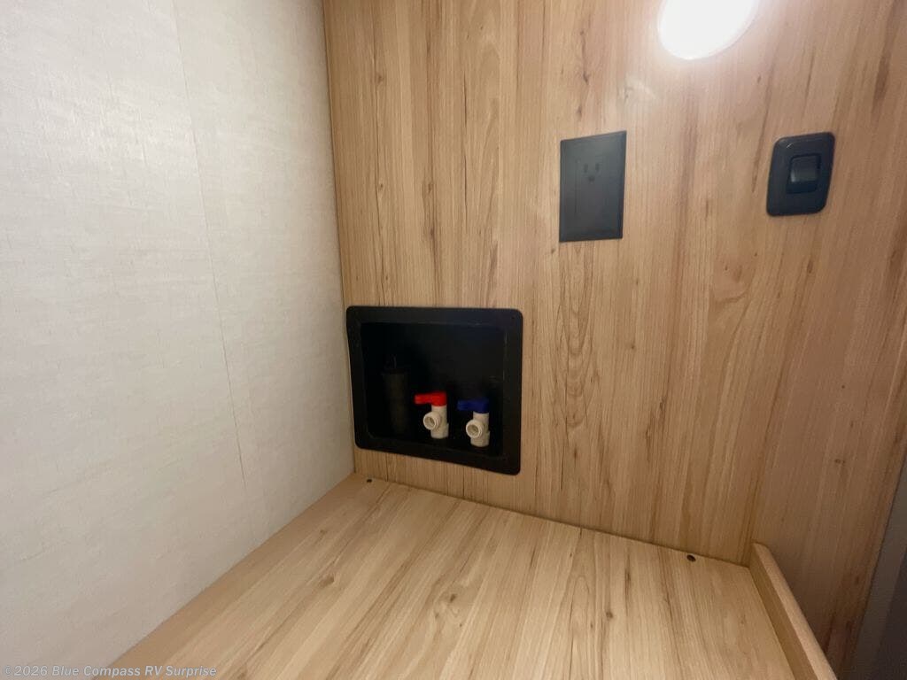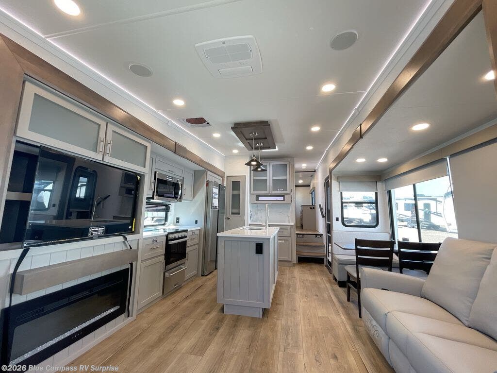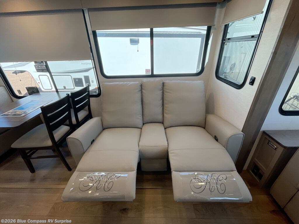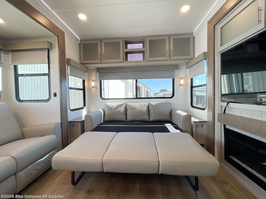 A kitchen island with countertop space makes it easy to prepare meals in this fifth wheel! The floating dinette table has two chairs on one side and a movable ottoman with flip up storage on the other side to keep your games or extra table cloths in. You can store your dishes and snacks inside the hutch/pantry or in the second pantry. The front private bedroom has a queen bed slide but can be switched out for the optional king bed if you like. There is also a dresser and large wardrobe for storage, and either side of the wardrobe with washer and dryer prep. The rear living area features a dual recliner theater seat across from an entertainment center with a 50" class HDTV with hidden storage behind it, and is also on a swing mount for all to see even at the rear sleeper sofa!