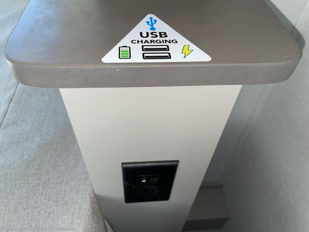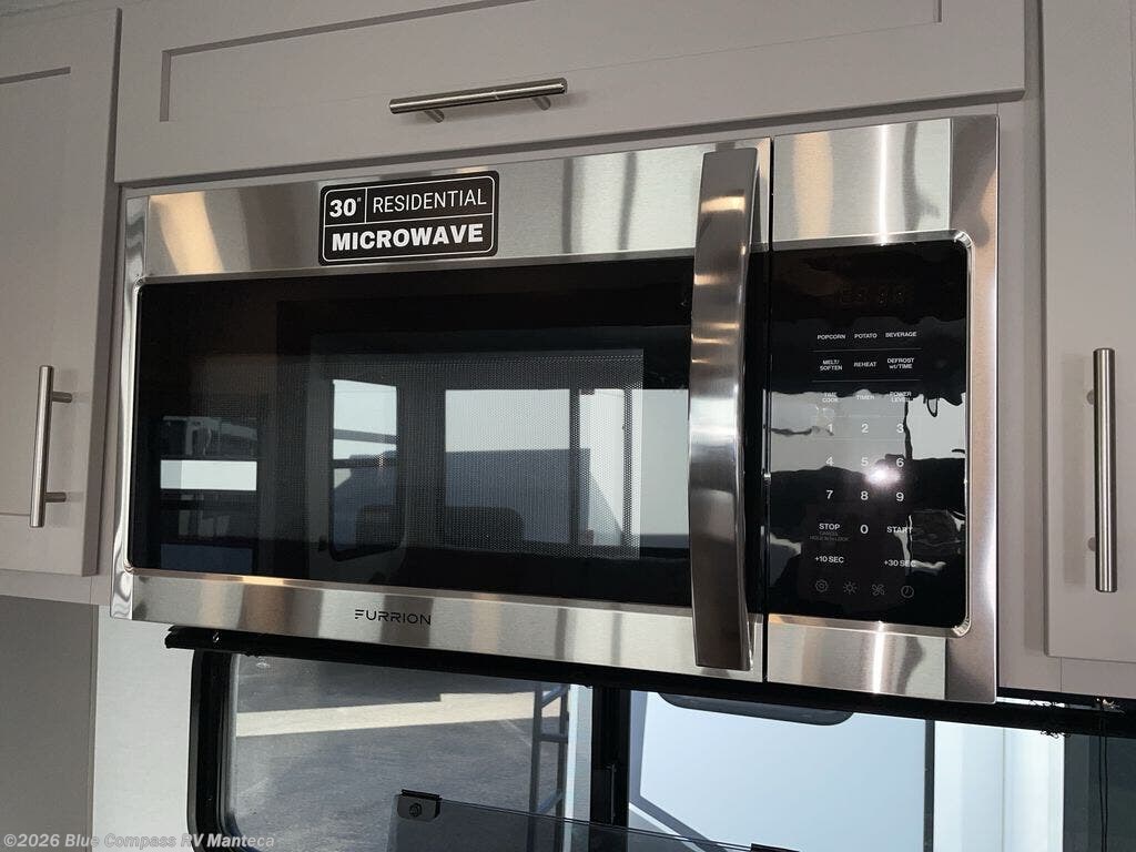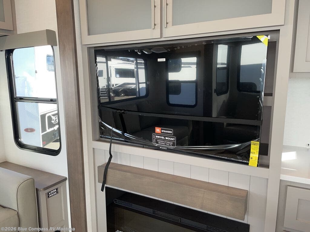 A kitchen island with countertop space makes it easy to prepare meals in this fifth wheel! The floating dinette table has two chairs on one side and a movable ottoman with flip up storage on the other side to keep your games or extra table cloths in. You can store your dishes and snacks inside the hutch/pantry or in the second pantry. The front private bedroom has a queen bed slide but can be switched out for the optional king bed if you like. There is also a dresser and large wardrobe for storage, and either side of the wardrobe with washer and dryer prep. The rear living area features a dual recliner theater seat across from an entertainment center with a 50" class HDTV with hidden storage behind it, and is also on a swing mount for all to see even at the rear sleeper sofa!