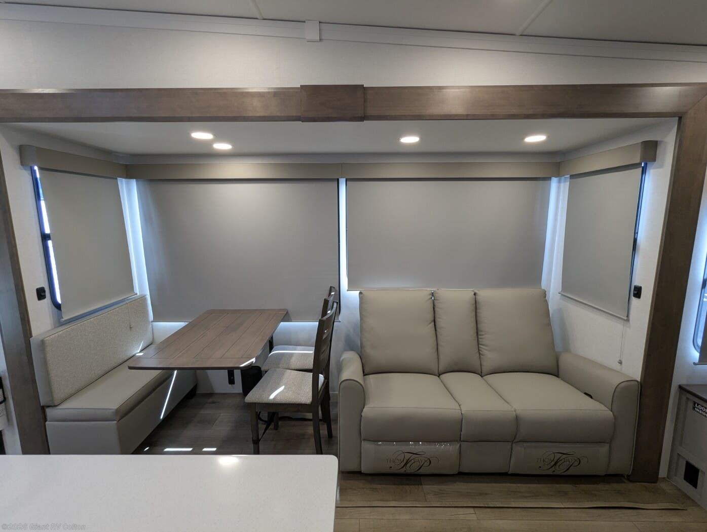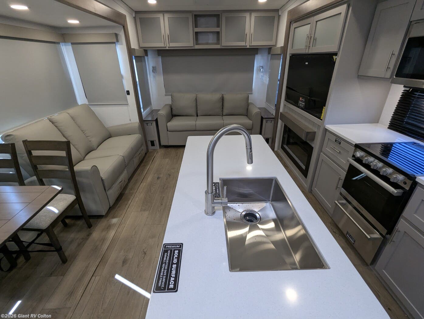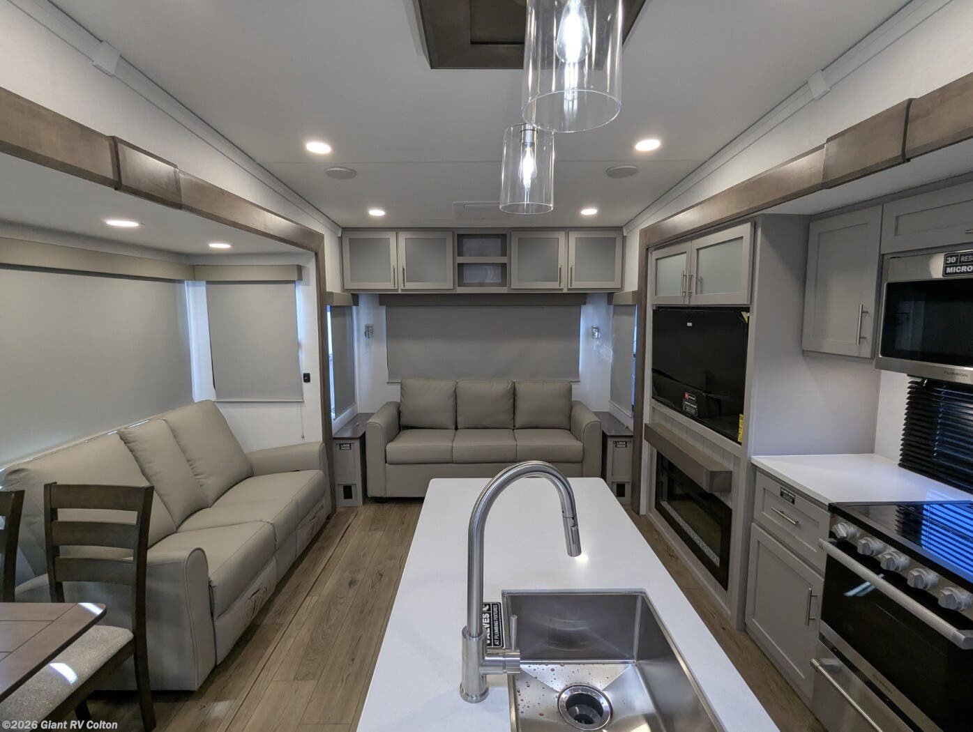 - Rear Living Retreat: Sleeps up to 4 with theater seating, floating dinette table with two chairs and movable ottoman with hidden storage, plus front queen bed for open, inviting space.