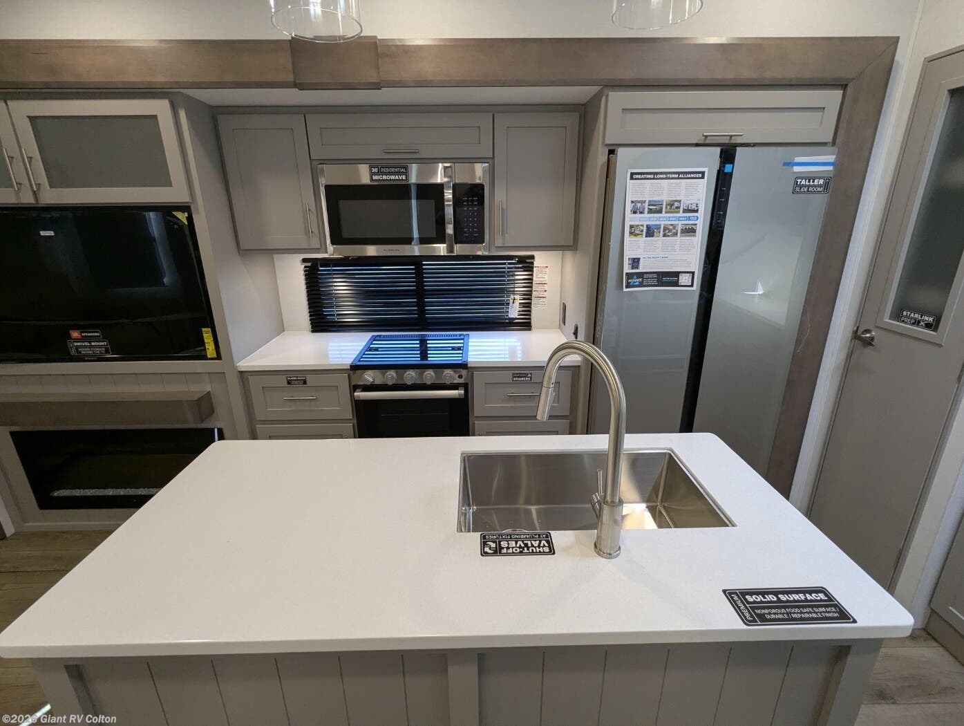 - Kitchen Island Excellence: Includes ample counter space in the fully equipped kitchen, plus atrium windows for spectacular views and a spacious living area enhanced by slideouts.