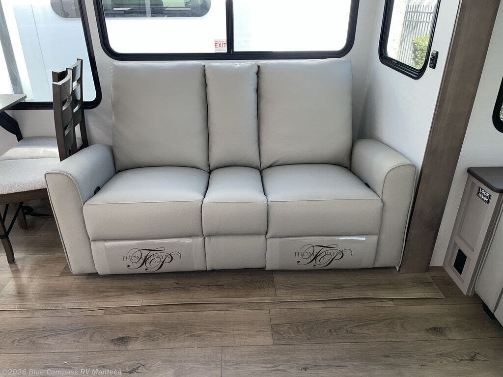A kitchen island with countertop space makes it easy to prepare meals in this fifth wheel! The floating dinette table has two chairs on one side and a movable ottoman with flip up storage on the other side to keep your games or extra table cloths in. You can store your dishes and snacks inside the hutch/pantry or in the second pantry. The front private bedroom has a queen bed slide but can be switched out for the optional king bed if you like. There is also a dresser and large wardrobe for storage, and either side of the wardrobe with washer and dryer prep. The rear living area features a dual recliner theater seat across from an entertainment center with a 50" class HDTV with hidden storage behind it, and is also on a swing mount for all to see even at the rear sleeper sofa!