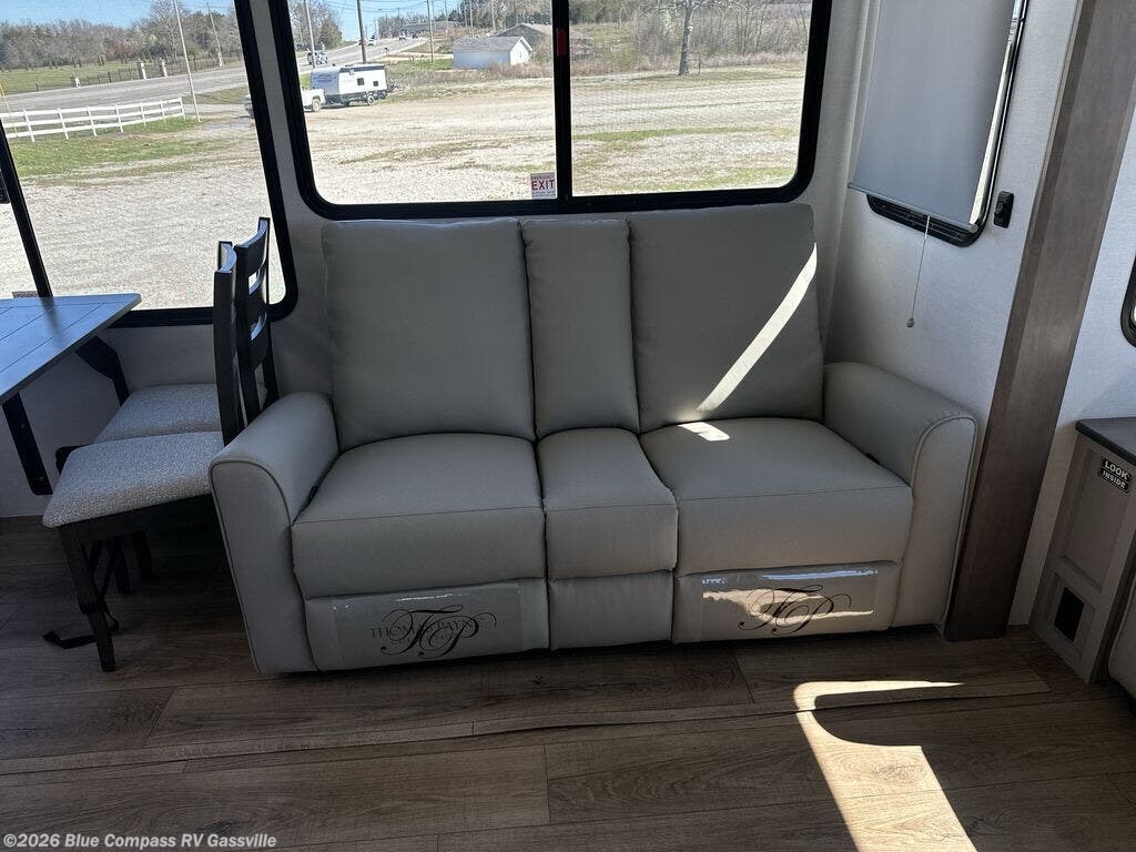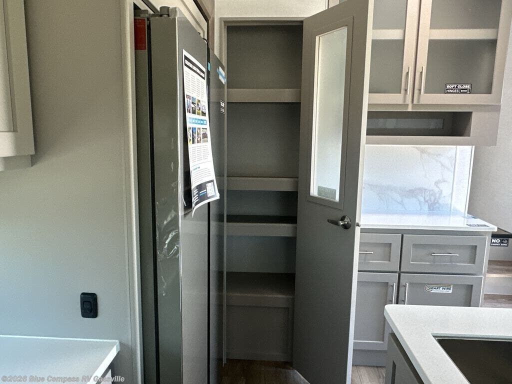 A kitchen island with countertop space makes it easy to prepare meals in this fifth wheel! The floating dinette table has two chairs on one side and a movable ottoman with flip up storage on the other side to keep your games or extra table cloths in. You can store your dishes and snacks inside the hutch/pantry or in the second pantry. The front private bedroom has a queen bed slide but can be switched out for the optional king bed if you like. There is also a dresser and large wardrobe for storage, and either side of the wardrobe with washer and dryer prep. The rear living area features a dual recliner theater seat across from an entertainment center with a 50" class HDTV with hidden storage behind it, and is also on a swing mount for all to see even at the rear sleeper sofa!