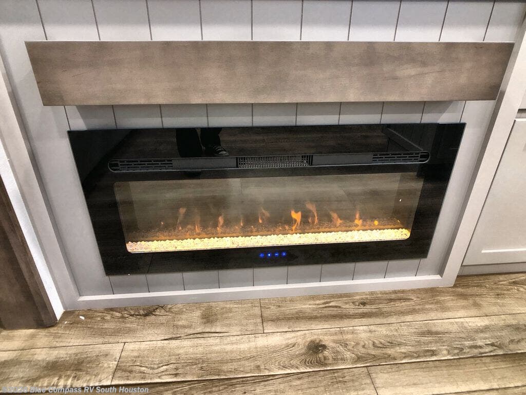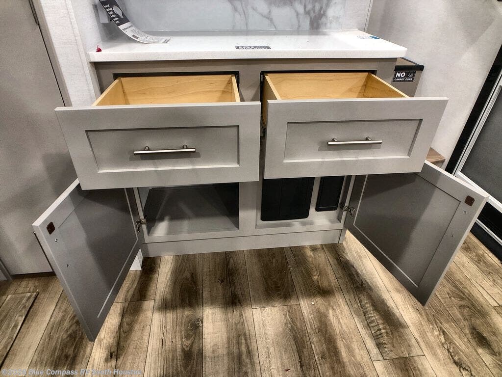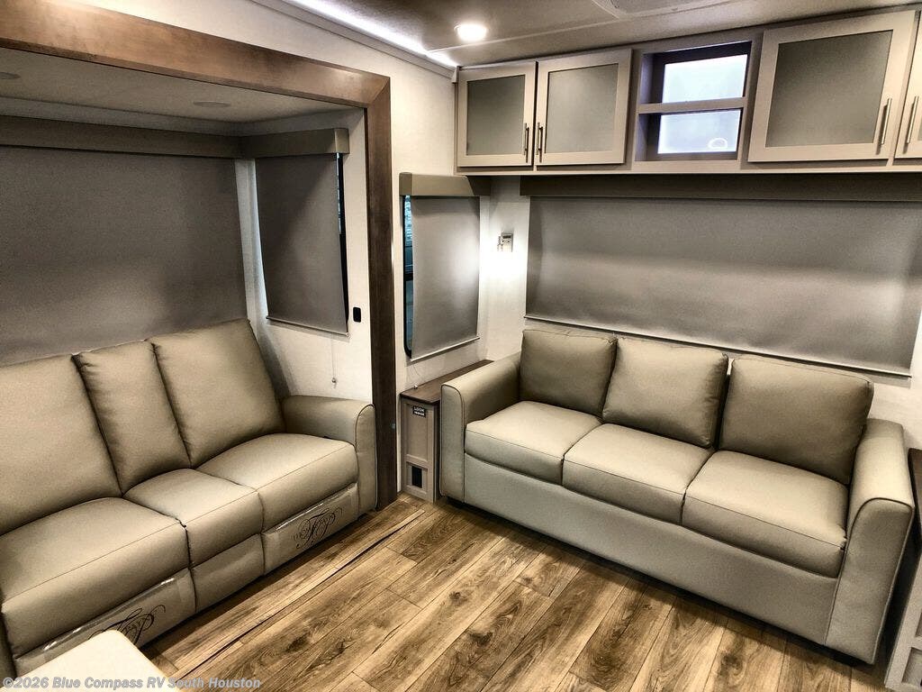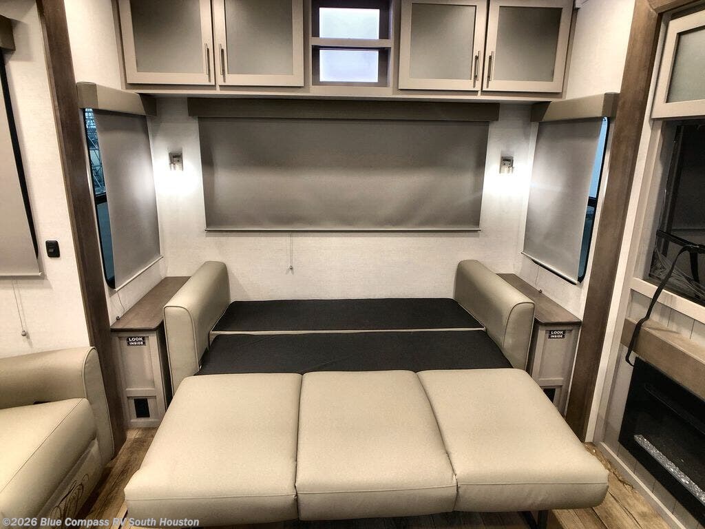 A kitchen island with countertop space makes it easy to prepare meals in this fifth wheel! The floating dinette table has two chairs on one side and a movable ottoman with flip up storage on the other side to keep your games or extra table cloths in. You can store your dishes and snacks inside the hutch/pantry or in the second pantry. The front private bedroom has a queen bed slide but can be switched out for the optional king bed if you like. There is also a dresser and large wardrobe for storage, and either side of the wardrobe with washer and dryer prep. The rear living area features a dual recliner theater seat across from an entertainment center with a 50" class HDTV with hidden storage behind it, and is also on a swing mount for all to see even at the rear sleeper sofa!