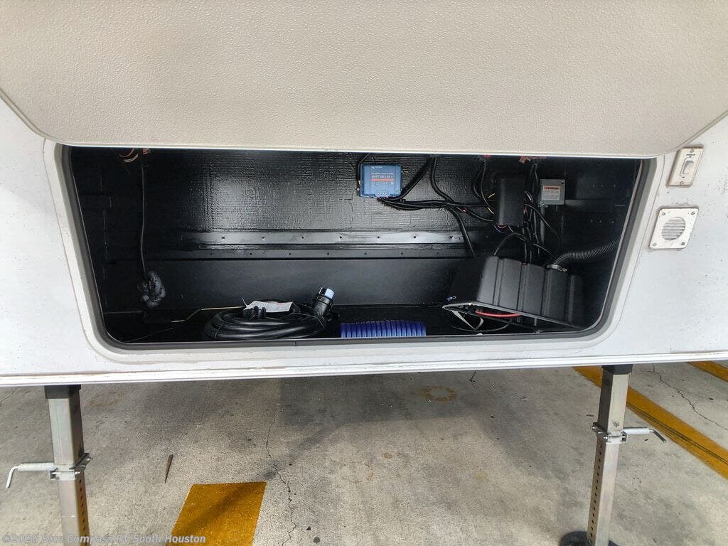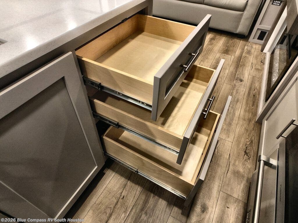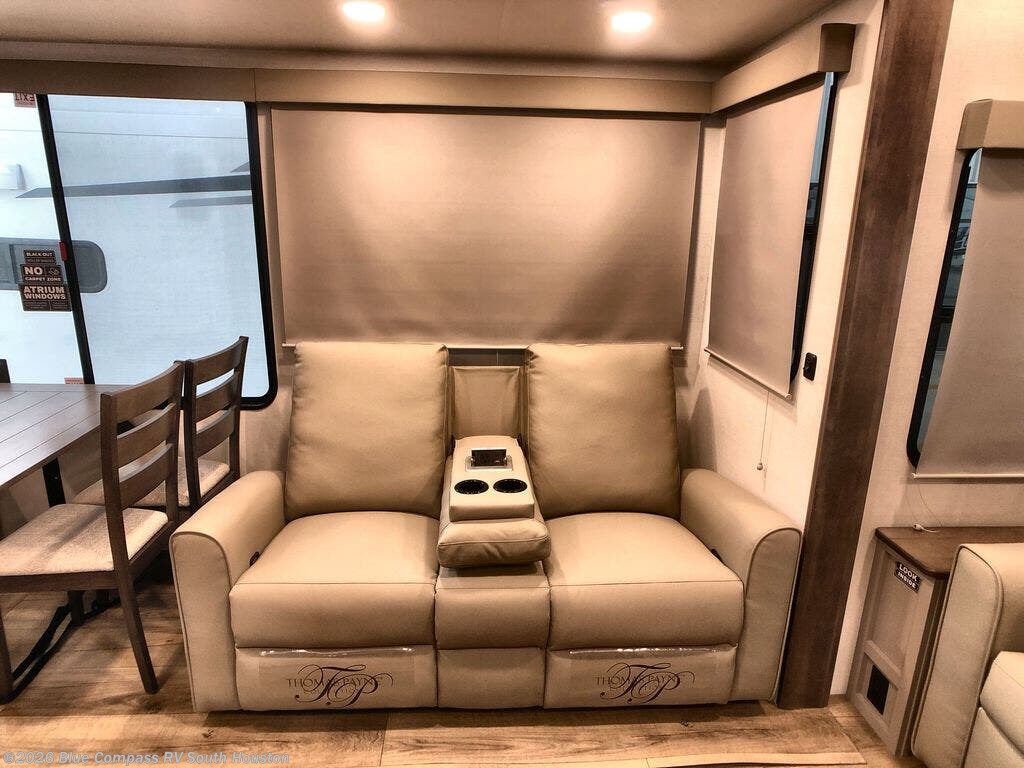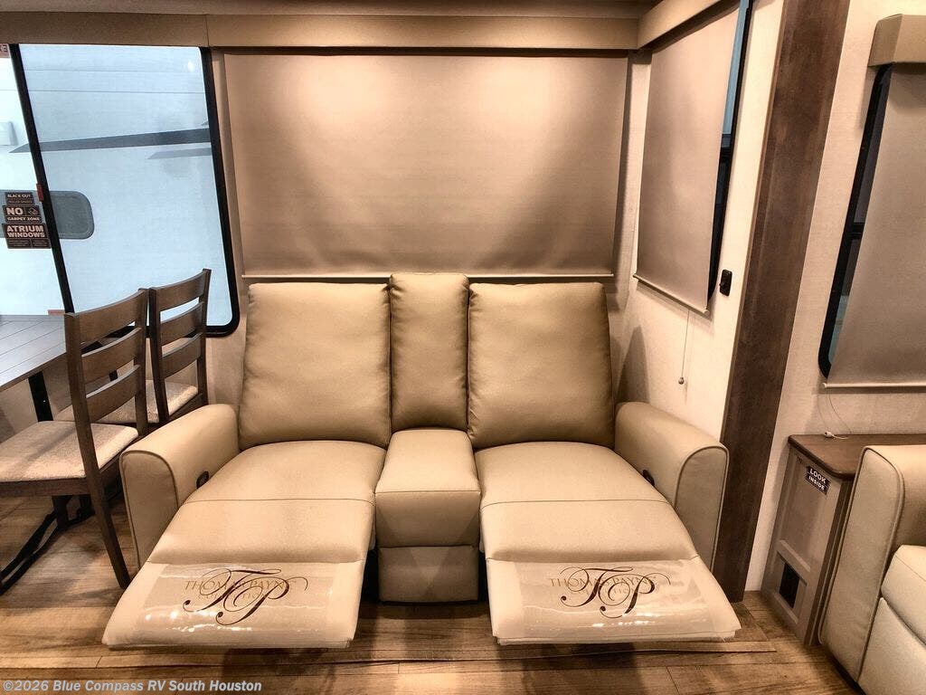 A kitchen island with countertop space makes it easy to prepare meals in this fifth wheel! The floating dinette table has two chairs on one side and a movable ottoman with flip up storage on the other side to keep your games or extra table cloths in. You can store your dishes and snacks inside the hutch/pantry or in the second pantry. The front private bedroom has a queen bed slide but can be switched out for the optional king bed if you like. There is also a dresser and large wardrobe for storage, and either side of the wardrobe with washer and dryer prep. The rear living area features a dual recliner theater seat across from an entertainment center with a 50" class HDTV with hidden storage behind it, and is also on a swing mount for all to see even at the rear sleeper sofa!