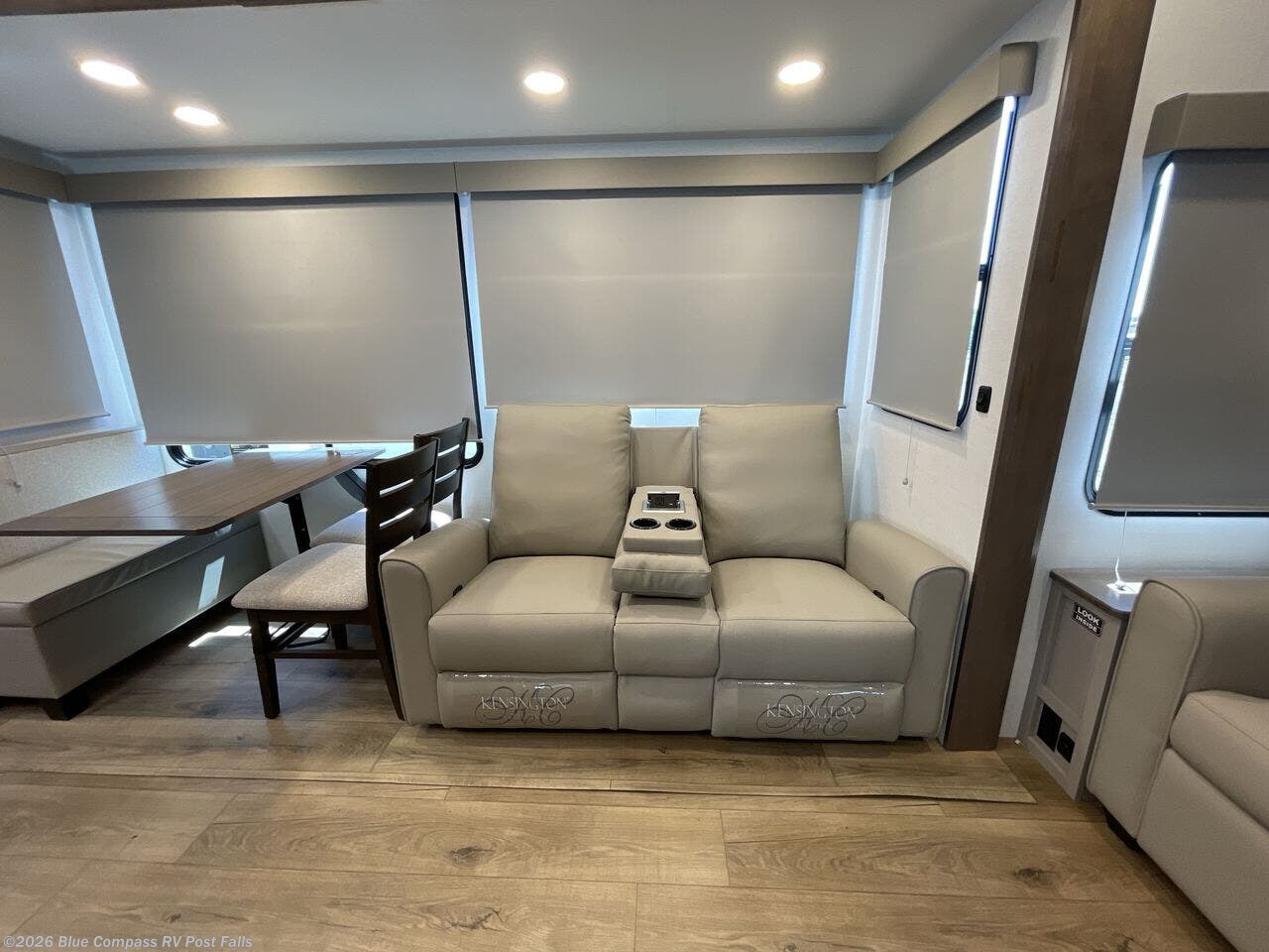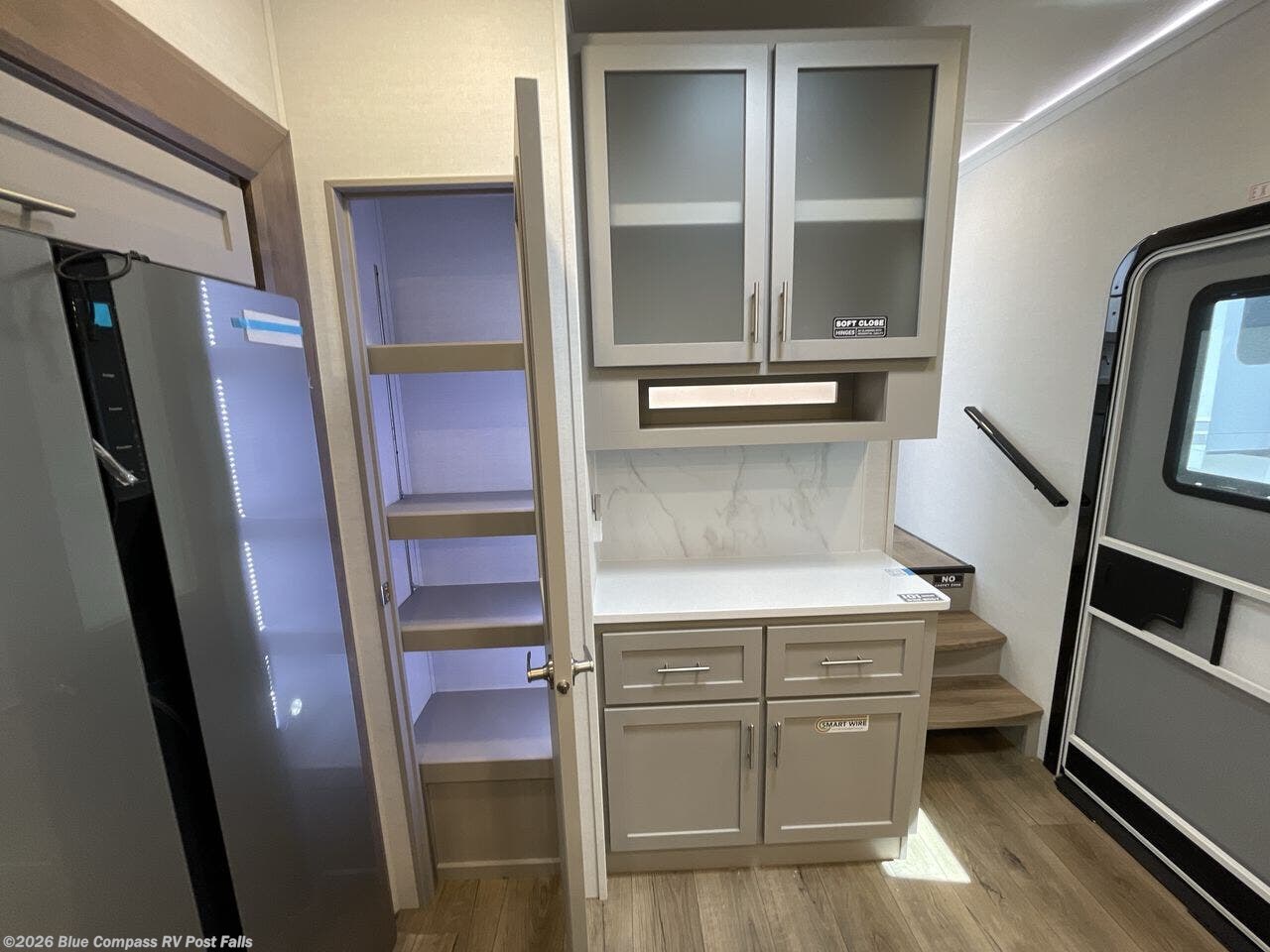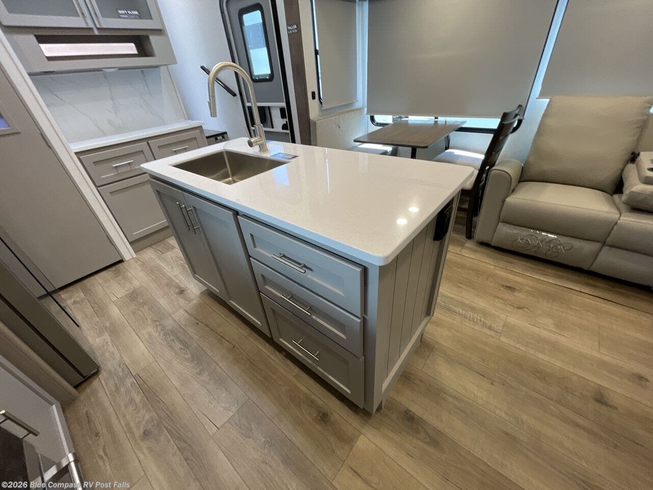 A kitchen island with countertop space makes it easy to prepare meals in this fifth wheel! The floating dinette table has two chairs on one side and a movable ottoman with flip up storage on the other side to keep your games or extra table cloths in. You can store your dishes and snacks inside the hutch/pantry or in the second pantry. The front private bedroom has a queen bed slide but can be switched out for the optional king bed if you like. There is also a dresser and large wardrobe for storage, and either side of the wardrobe with washer and dryer prep. The rear living area features a dual recliner theater seat across from an entertainment center with a 50" class HDTV with hidden storage behind it, and is also on a swing mount for all to see even at the rear sleeper sofa!