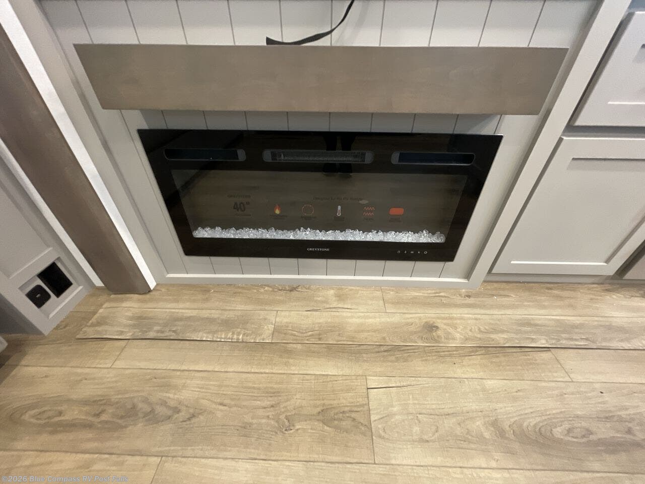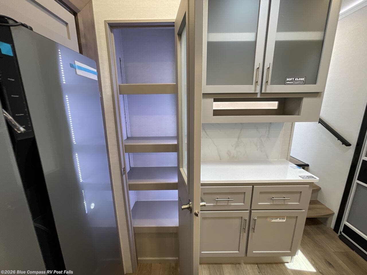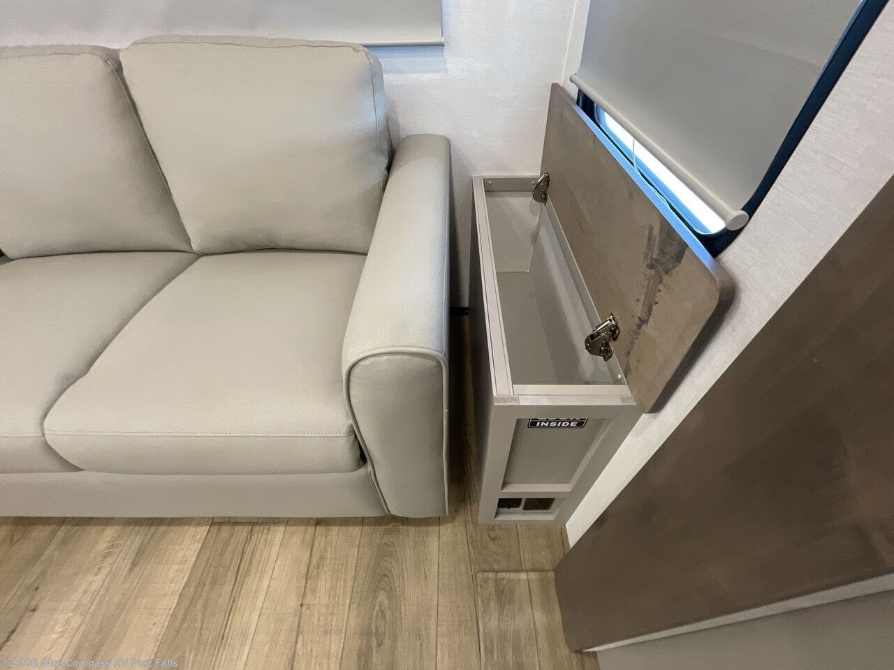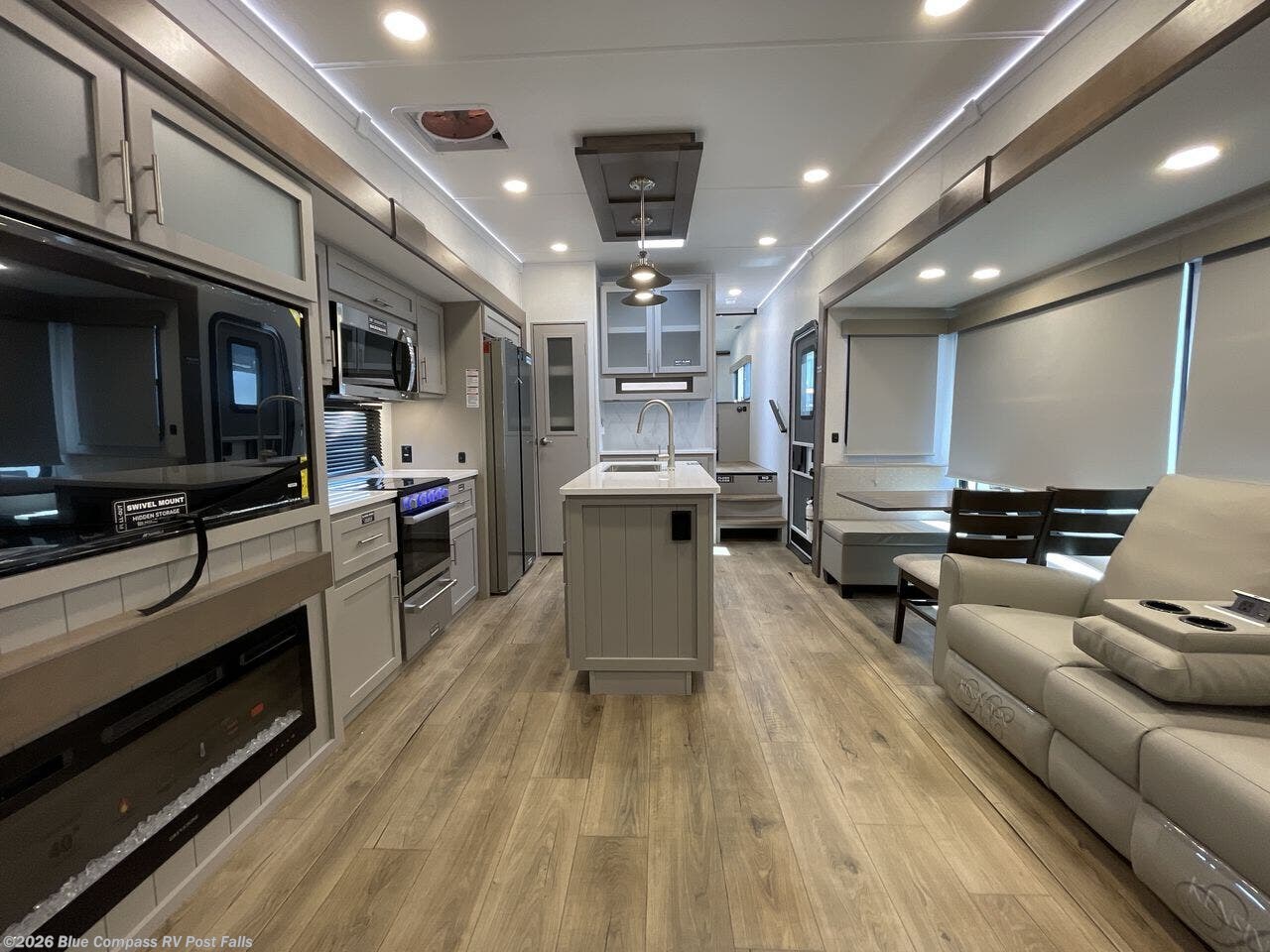 A kitchen island with countertop space makes it easy to prepare meals in this fifth wheel! The floating dinette table has two chairs on one side and a movable ottoman with flip up storage on the other side to keep your games or extra table cloths in. You can store your dishes and snacks inside the hutch/pantry or in the second pantry. The front private bedroom has a queen bed slide but can be switched out for the optional king bed if you like. There is also a dresser and large wardrobe for storage, and either side of the wardrobe with washer and dryer prep. The rear living area features a dual recliner theater seat across from an entertainment center with a 50" class HDTV with hidden storage behind it, and is also on a swing mount for all to see even at the rear sleeper sofa!