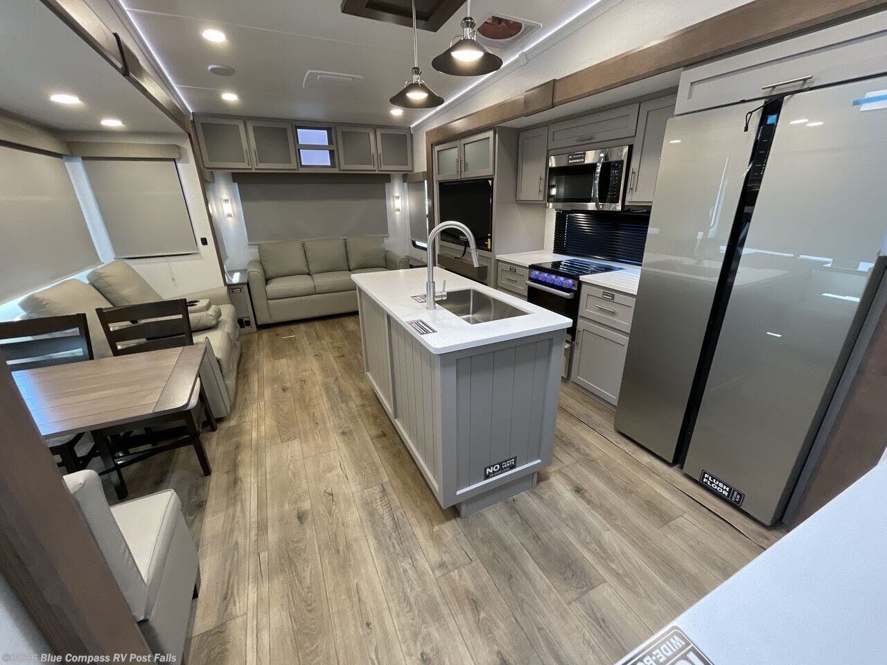With any Avenue fifth wheel or travel trailer by Alliance RV, you will enjoy more interior space provided by the 8' 5" wide-body construction, and a long list of luxury features. Each is built with Azdel composite sidewalls both inside and out, along with a PVC roof for added strength. There are innovative storage solutions that include hidden storage behind the TV, within end tables and ottomans, and more. Since these units feature no carpet throughout, cleaning will be easier than ever, and there are flush floor slides throughout for seamless living spaces. The Avenue also comes with the OTG Solar Package with a 400 watt solar panel, inverter prep, multiple outlets, and more to keep you charged up!