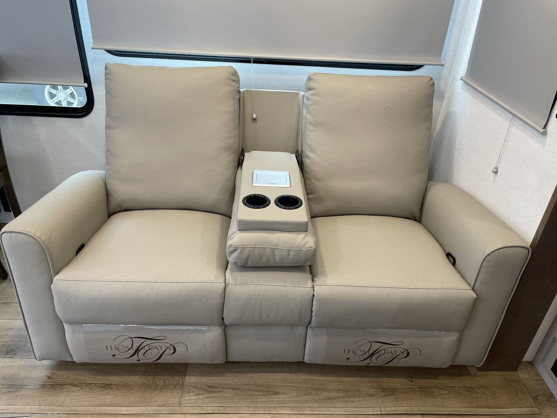 A kitchen island with countertop space makes it easy to prepare meals in this fifth wheel! The floating dinette table has two chairs on one side and a movable ottoman with flip up storage on the other side to keep your games or extra table cloths in. You can store your dishes and snacks inside the hutch/pantry or in the second pantry. The front private bedroom has a queen bed slide but can be switched out for the optional king bed if you like. There is also a dresser and large wardrobe for storage, and either side of the wardrobe with washer and dryer prep. The rear living area features a dual recliner theater seat across from an entertainment center with a 50" class HDTV with hidden storage behind it, and is also on a swing mount for all to see even at the rear sleeper sofa!