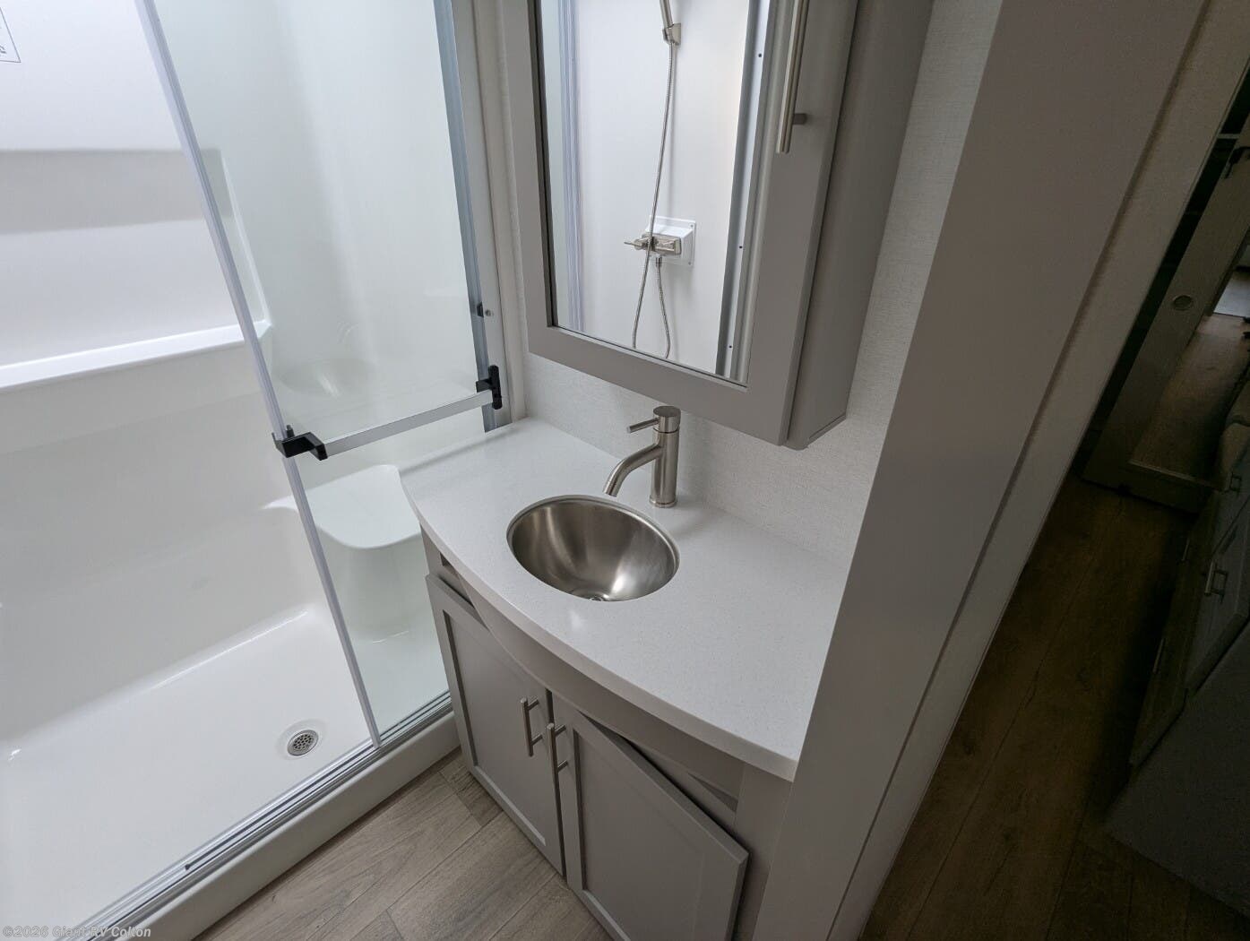 • Private Front Bedroom & Premium Features including a queen bed slide (king option), large wardrobe with washer/dryer prep, dual A/C (~27,000 BTU), 400W solar prep, no carpet interior, and innovative hidden storage throughout.