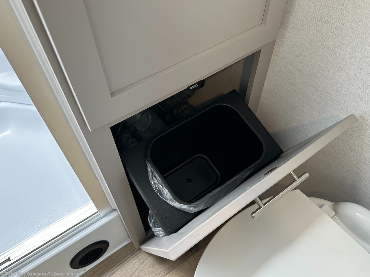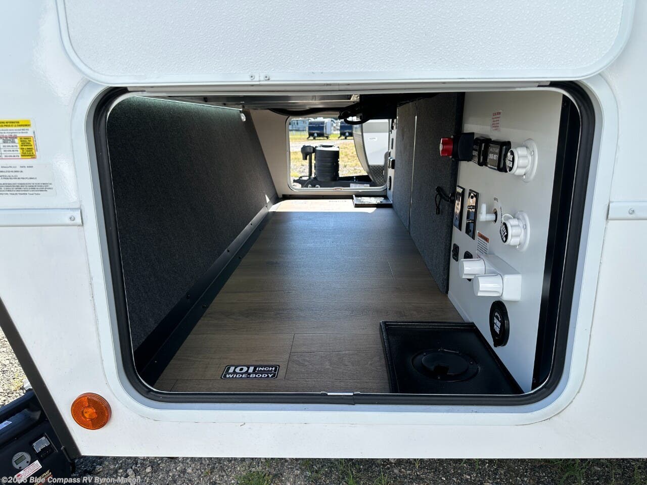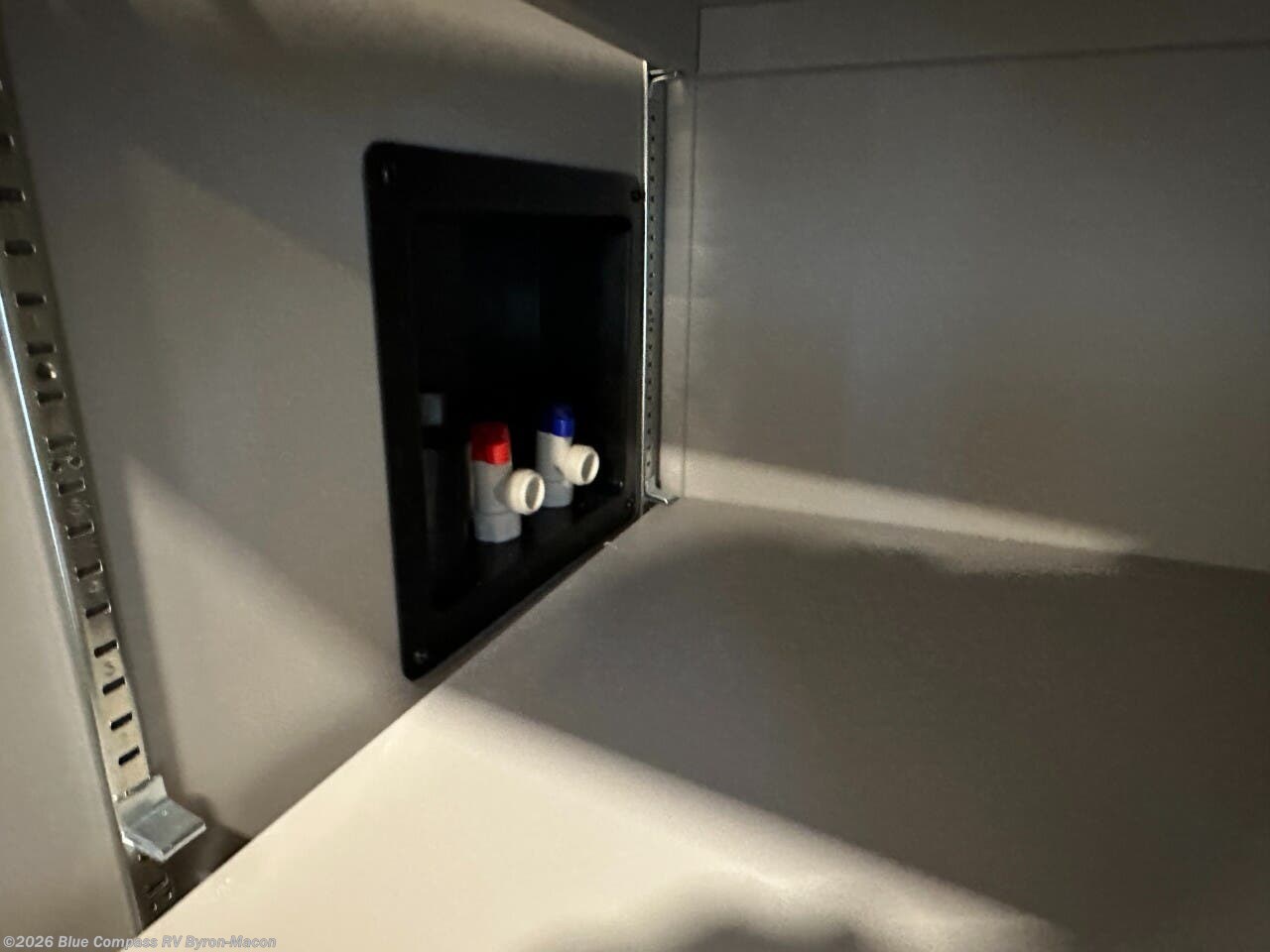 A kitchen island with countertop space makes it easy to prepare meals in this travel trailer! The floating dinette table has two chairs on one side and a movable ottoman with flip up storage on the other side to keep your games or extra table cloths in. You can store your dishes and snacks inside the hutch/pantry or in the second pantry. The front private bedroom has a queen bed slide but can be switched out for the optional king bed if you like. There is also a dresser and large wardrobe with shelving plus washer and dryer prep if you choose to add those appliances. The rear living area features a dual recliner theater seat across from an entertainment center with a 50" class HDTV with hidden storage behind it, and is also on a swing mount for all to see even at the rear sleeper sofa!