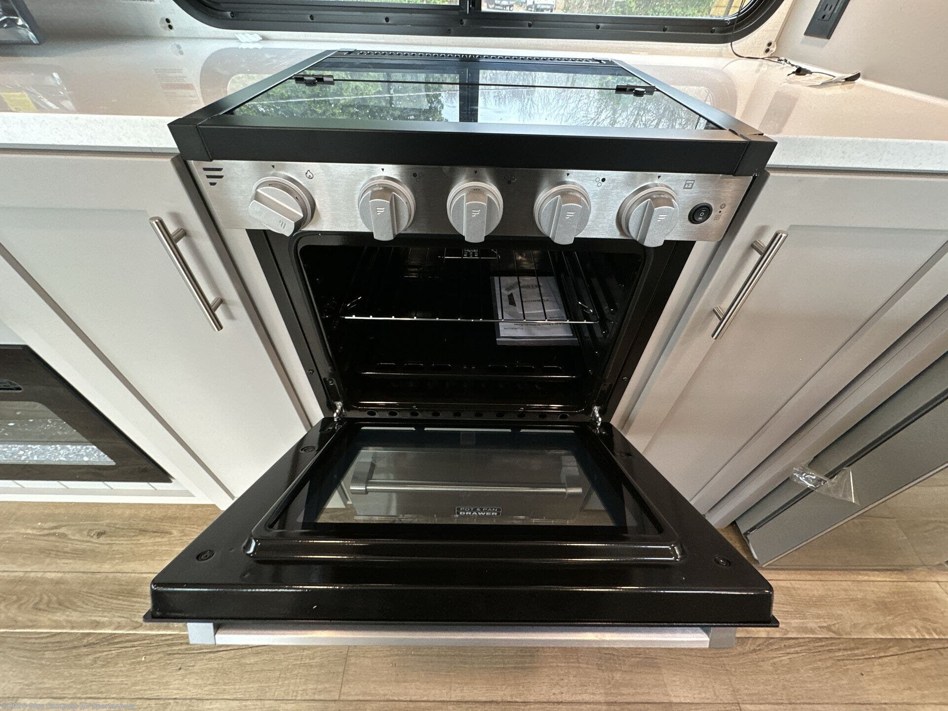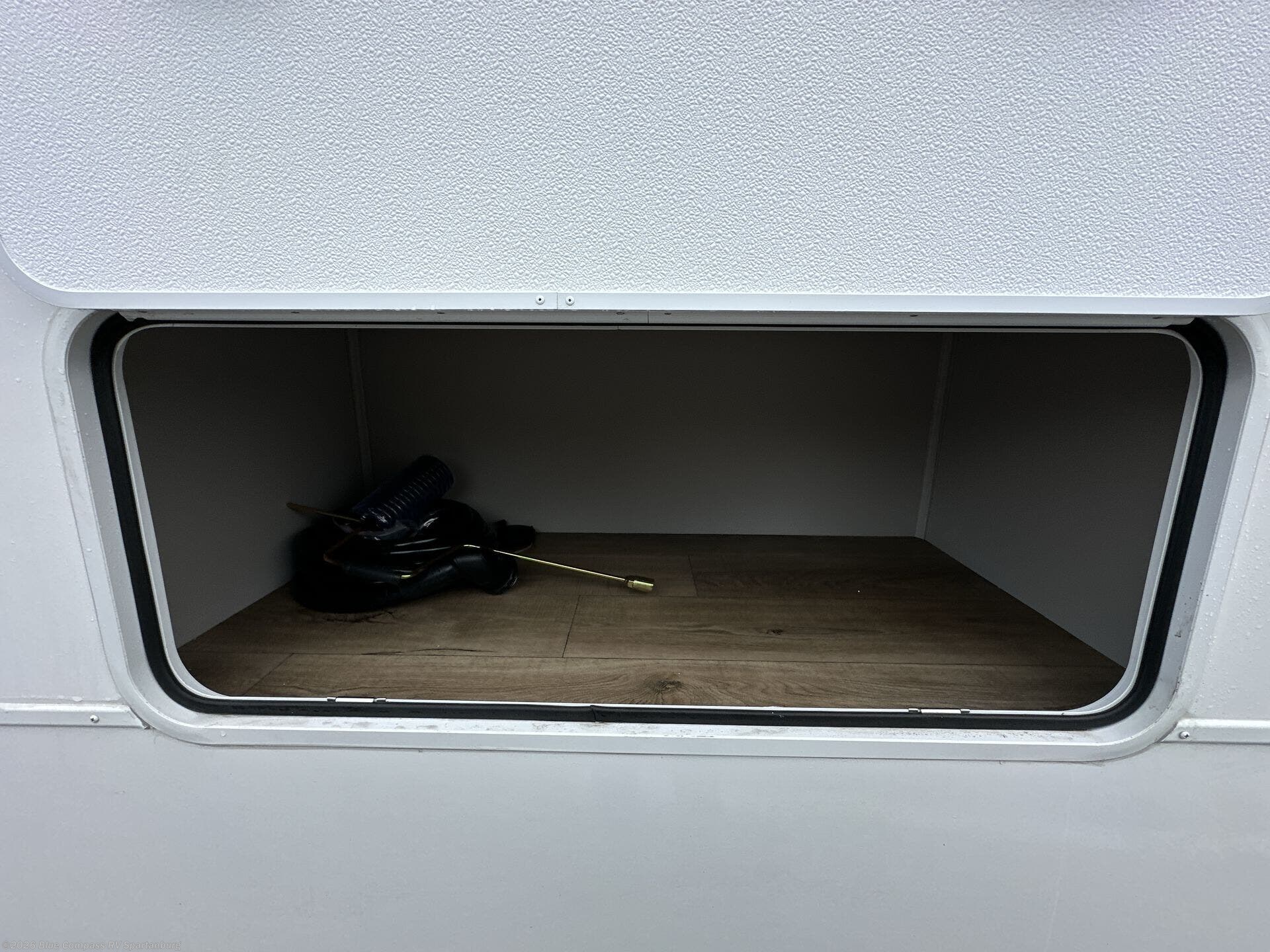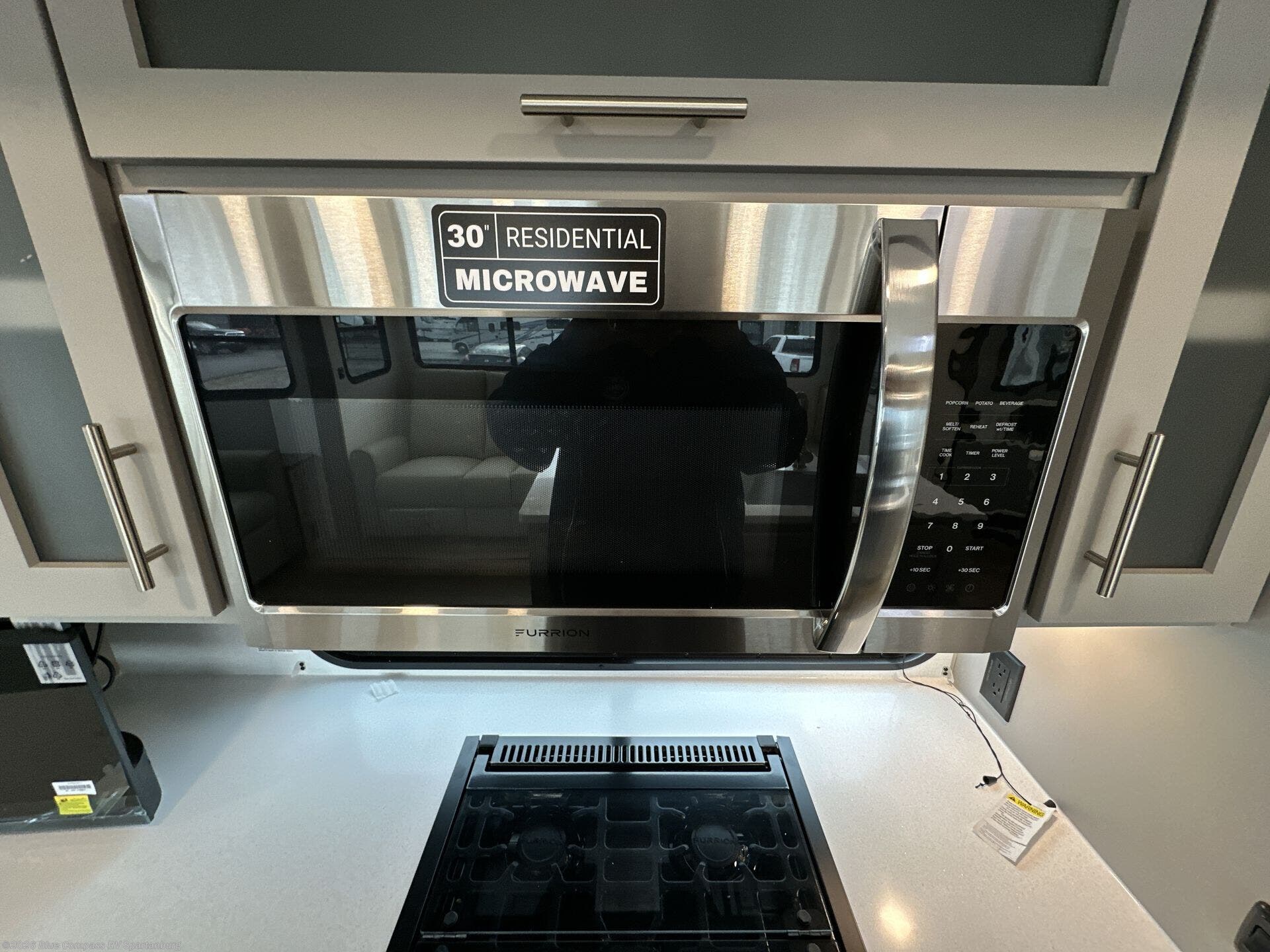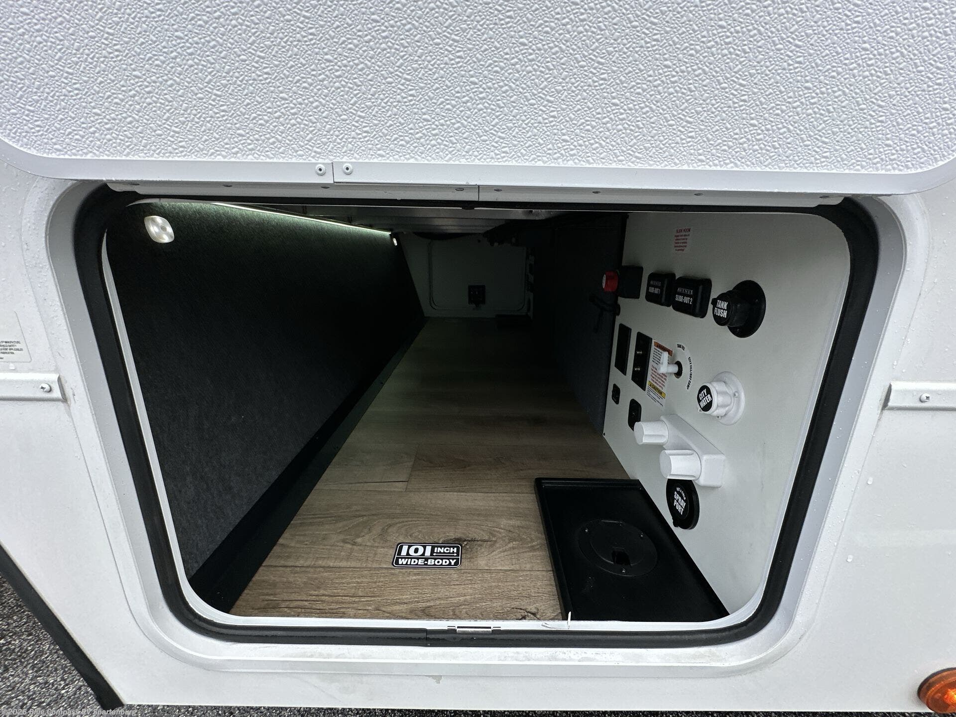 A kitchen island with countertop space makes it easy to prepare meals in this travel trailer! The floating dinette table has two chairs on one side and a movable ottoman with flip up storage on the other side to keep your games or extra table cloths in. You can store your dishes and snacks inside the hutch/pantry or in the second pantry. The front private bedroom has a queen bed slide but can be switched out for the optional king bed if you like. There is also a dresser and large wardrobe with shelving plus washer and dryer prep if you choose to add those appliances. The rear living area features a dual recliner theater seat across from an entertainment center with a 50" class HDTV with hidden storage behind it, and is also on a swing mount for all to see even at the rear sleeper sofa!
