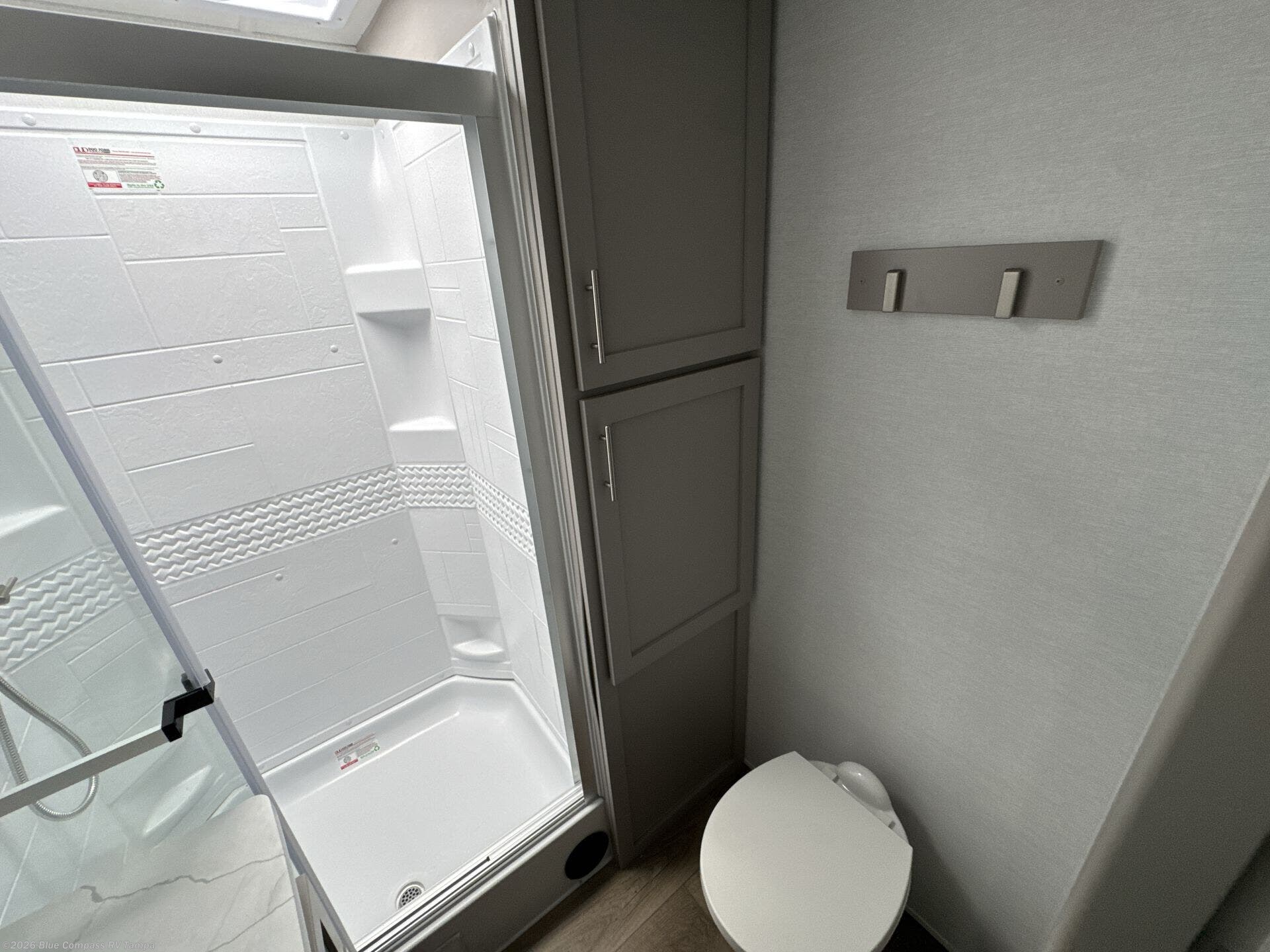 A kitchen island with countertop space makes it easy to prepare meals in this travel trailer! The floating dinette table has two chairs on one side and a movable ottoman with flip up storage on the other side to keep your games or extra table cloths in. You can store your dishes and snacks inside the hutch/pantry or in the second pantry. The front private bedroom has a queen bed slide but can be switched out for the optional king bed if you like. There is also a dresser and large wardrobe with shelving plus washer and dryer prep if you choose to add those appliances. The rear living area features a dual recliner theater seat across from an entertainment center with a 50" class HDTV with hidden storage behind it, and is also on a swing mount for all to see even at the rear sleeper sofa!