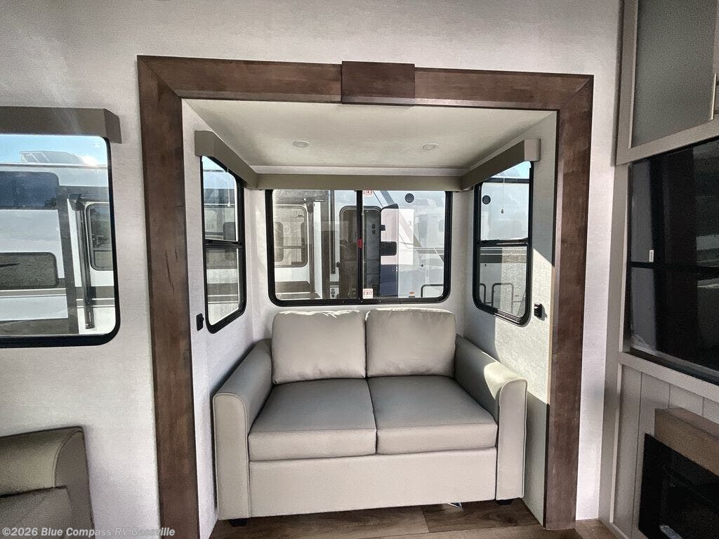 You're sure to love every minute spent in this triple slide out fifth wheel! There are dual sleeper sofas in the middle living area where your guests can sleep, while you take the queen bed slide out in the front bedroom. There is also a king bed option, a walk-in closet with washer and dryer prep, plus a dresser for even more storage. Back in the living area, you can relax on the dual recliner loveseat that sits across from the fireplace and 65" TV. Once dinner has been made on the three burner cooktop, you can dine at the floating dinette table with four chairs.
