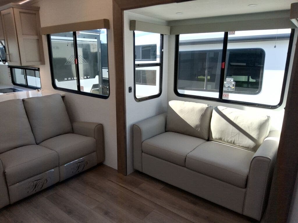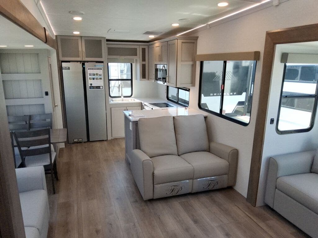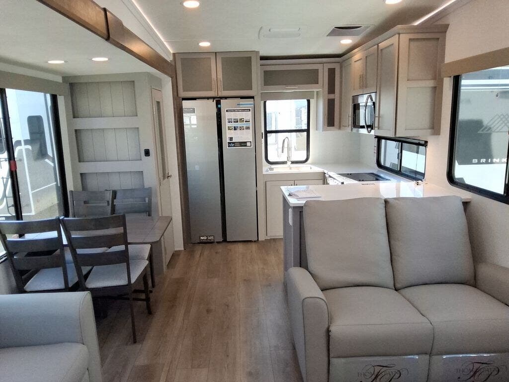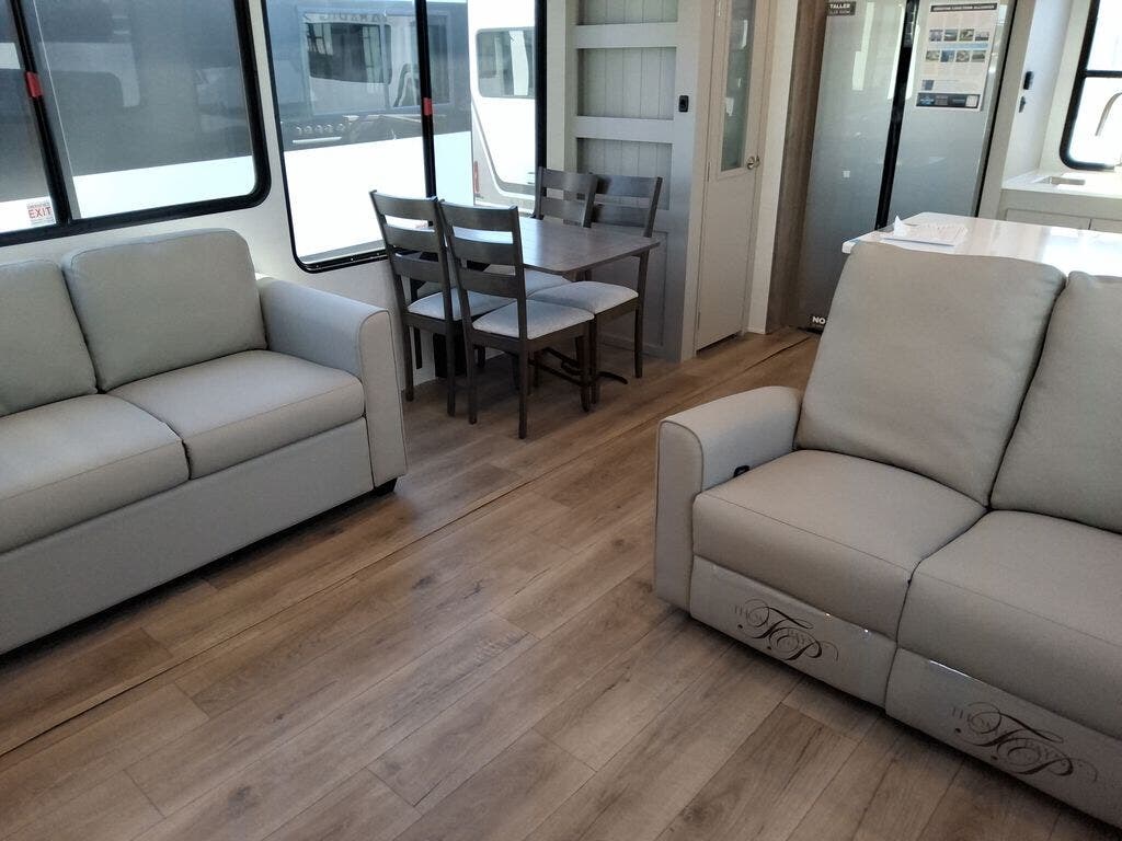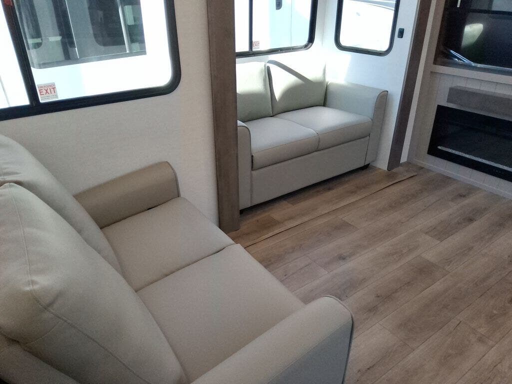 You're sure to love every minute spent in this triple slide out fifth wheel! There are dual sleeper sofas in the middle living area where your guests can sleep, while you take the queen bed slide out in the front bedroom. There is also a king bed option, a walk-in closet with washer and dryer prep, plus a dresser for even more storage. Back in the living area, you can relax on the dual recliner loveseat that sits across from the fireplace and 65" TV. Once dinner has been made on the three burner cooktop, you can dine at the floating dinette table with four chairs.