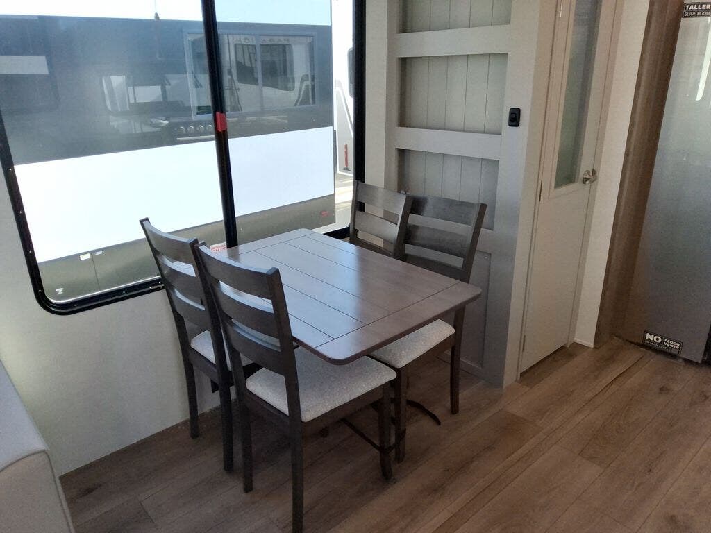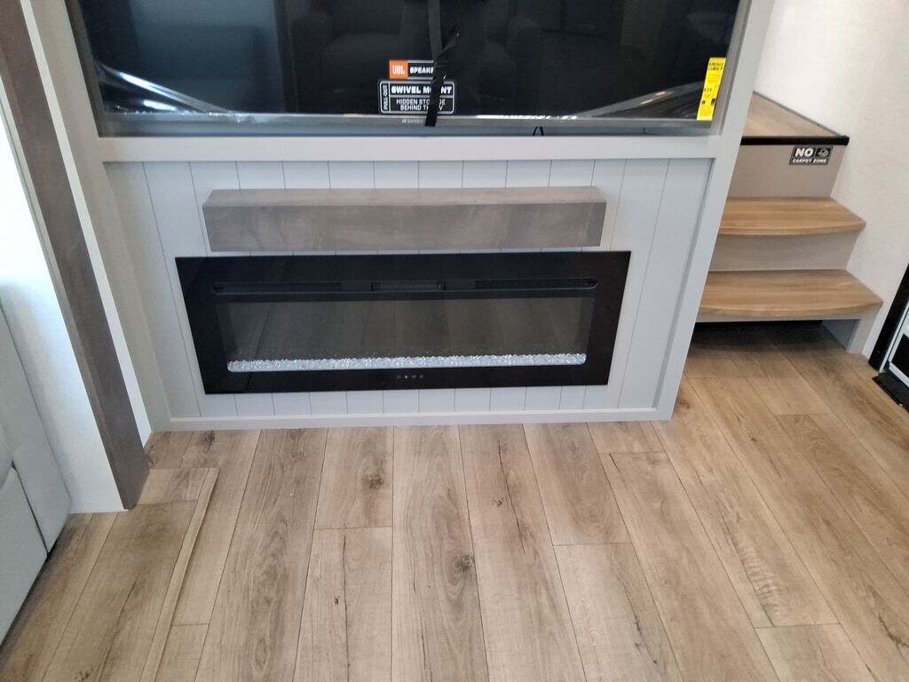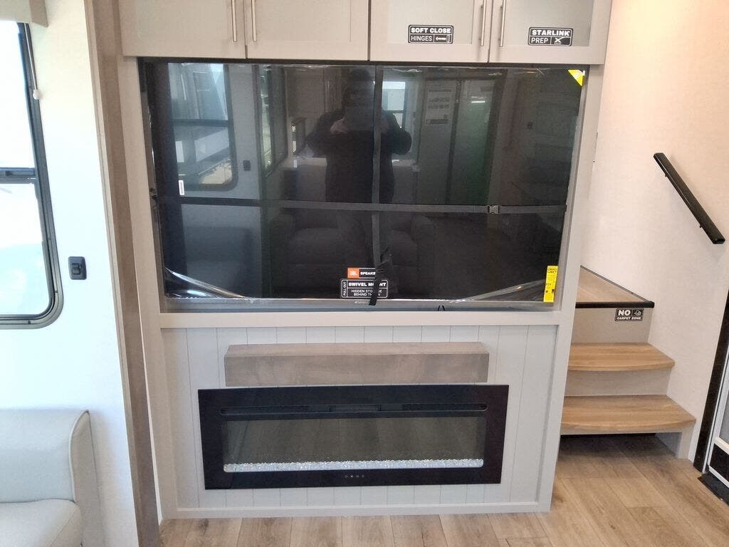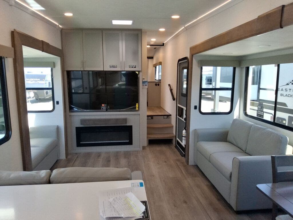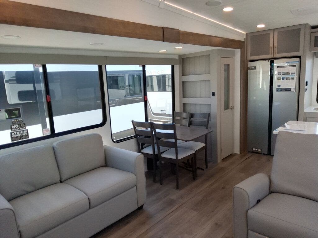 You're sure to love every minute spent in this triple slide out fifth wheel! There are dual sleeper sofas in the middle living area where your guests can sleep, while you take the queen bed slide out in the front bedroom. There is also a king bed option, a walk-in closet with washer and dryer prep, plus a dresser for even more storage. Back in the living area, you can relax on the dual recliner loveseat that sits across from the fireplace and 65" TV. Once dinner has been made on the three burner cooktop, you can dine at the floating dinette table with four chairs.