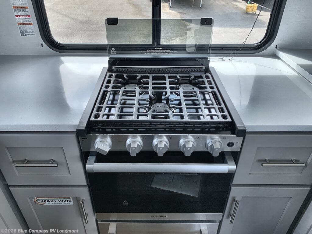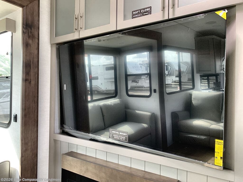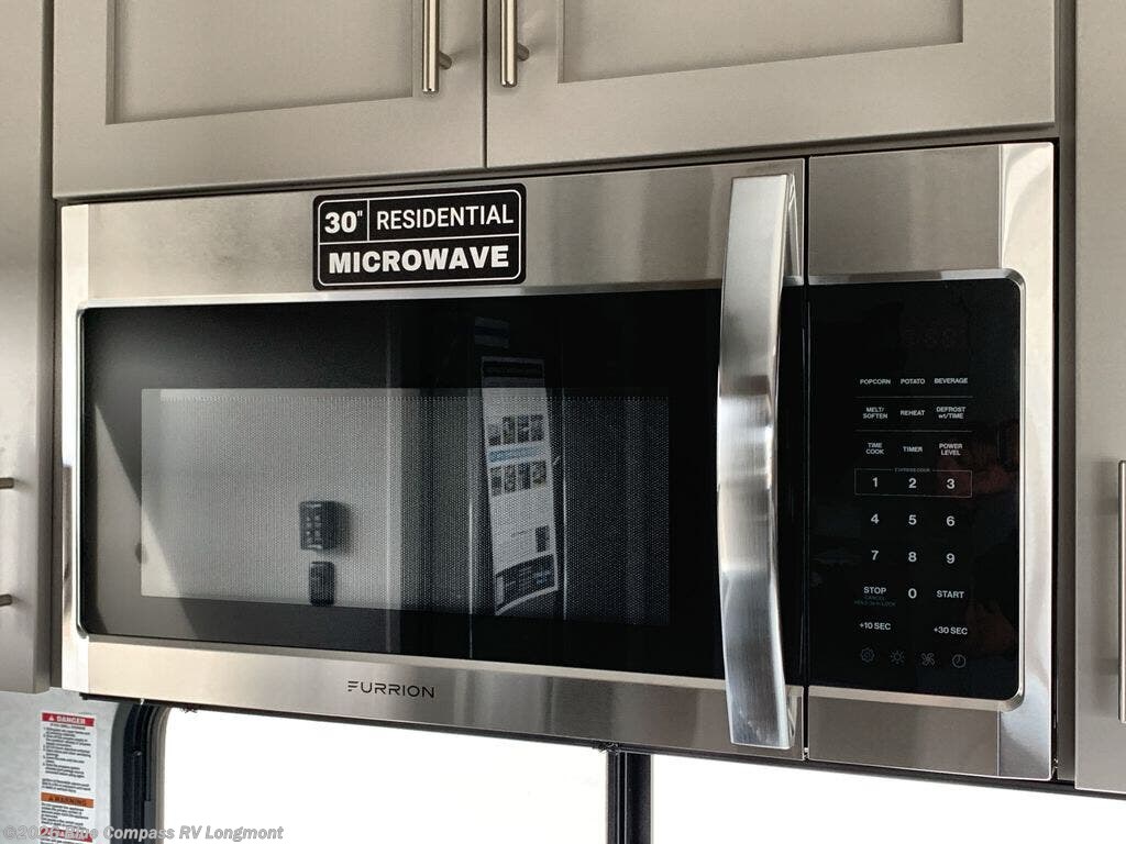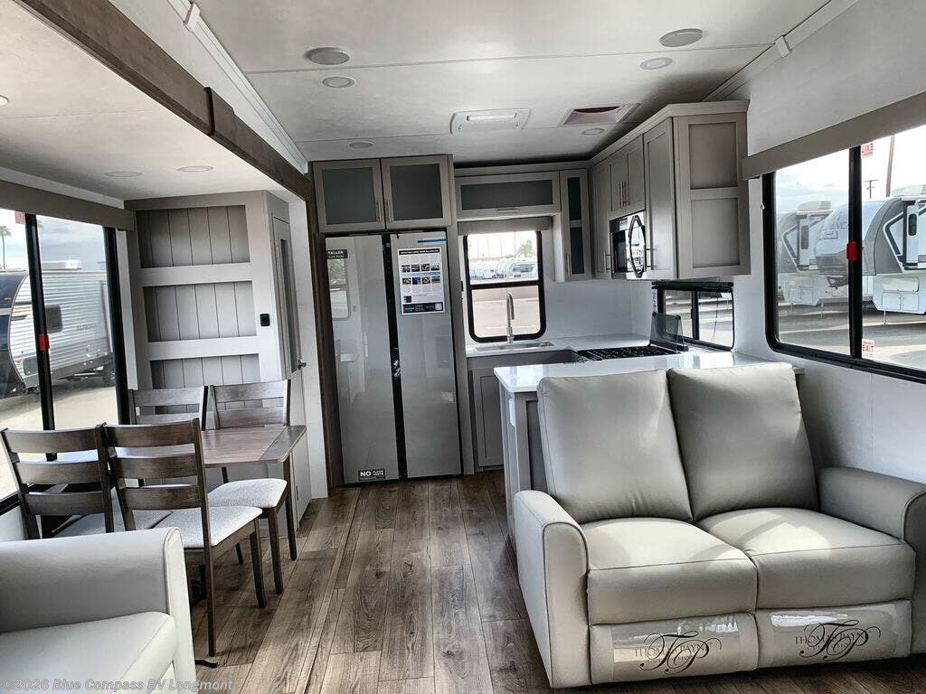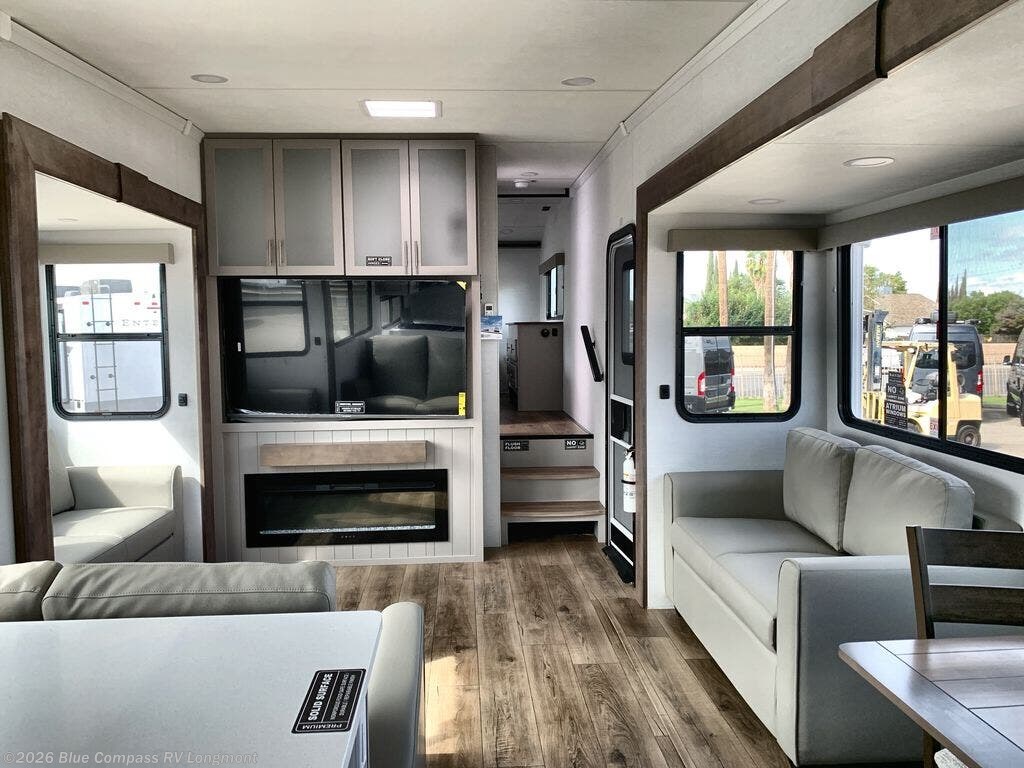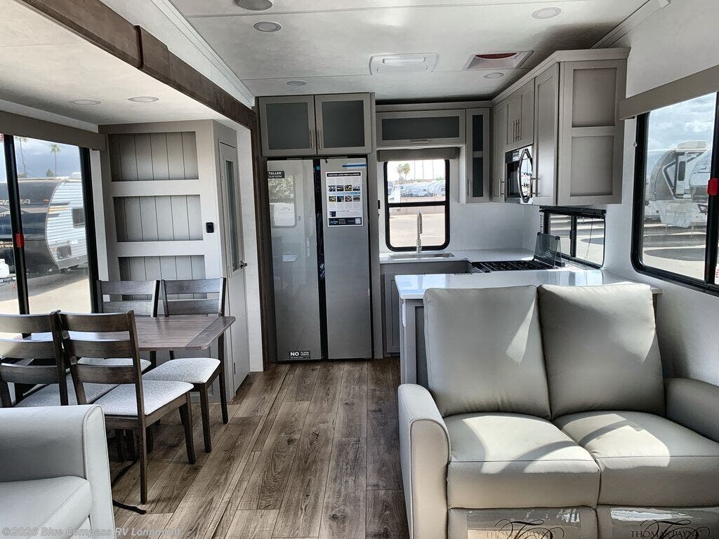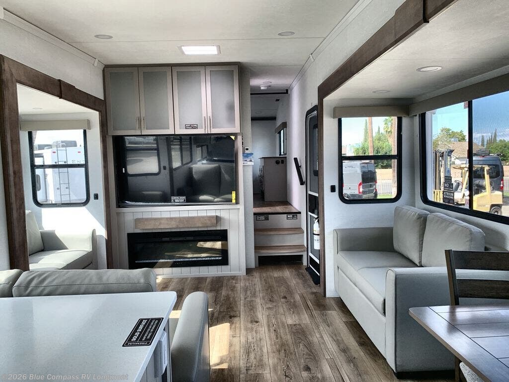 You're sure to love every minute spent in this triple slide out fifth wheel! There are dual sleeper sofas in the middle living area where your guests can sleep, while you take the queen bed slide out in the front bedroom. There is also a king bed option, a walk-in closet with washer and dryer prep, plus a dresser for even more storage. Back in the living area, you can relax on the dual recliner loveseat that sits across from the fireplace and 65" TV. Once dinner has been made on the three burner cooktop, you can dine at the floating dinette table with four chairs.
