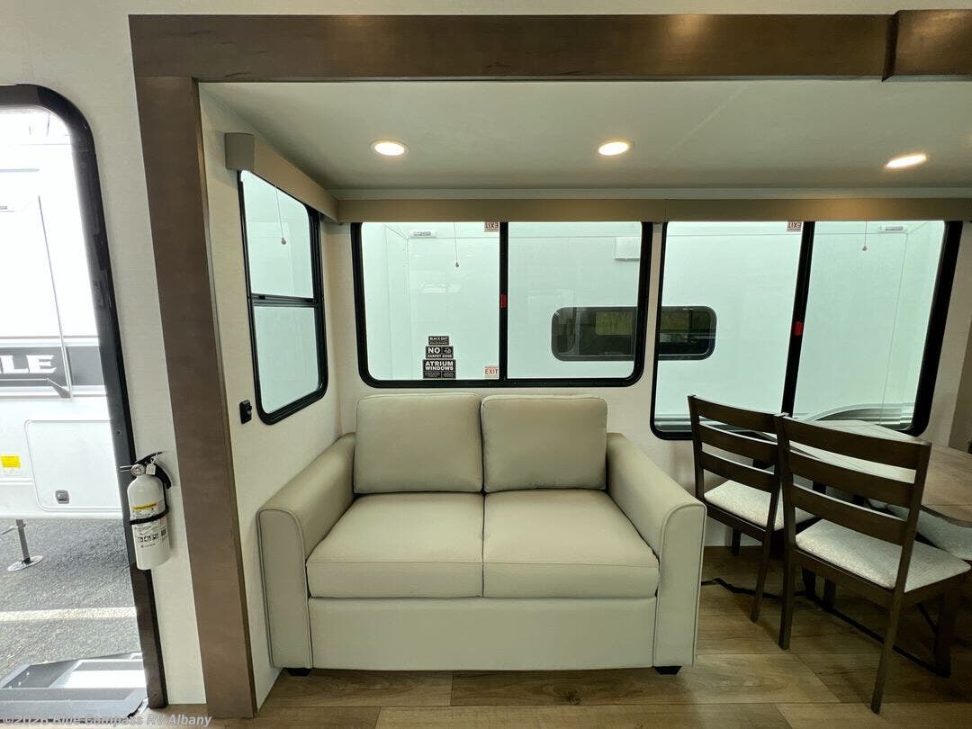 You're sure to love every minute spent in this triple slide out fifth wheel! There are dual sleeper sofas in the middle living area where your guests can sleep, while you take the queen bed slide out in the front bedroom. There is also a king bed option, a walk-in closet with washer and dryer prep, plus a dresser for even more storage. Back in the living area, you can relax on the dual recliner loveseat that sits across from the fireplace and 65" TV. Once dinner has been made on the three burner cooktop, you can dine at the floating dinette table with four chairs.