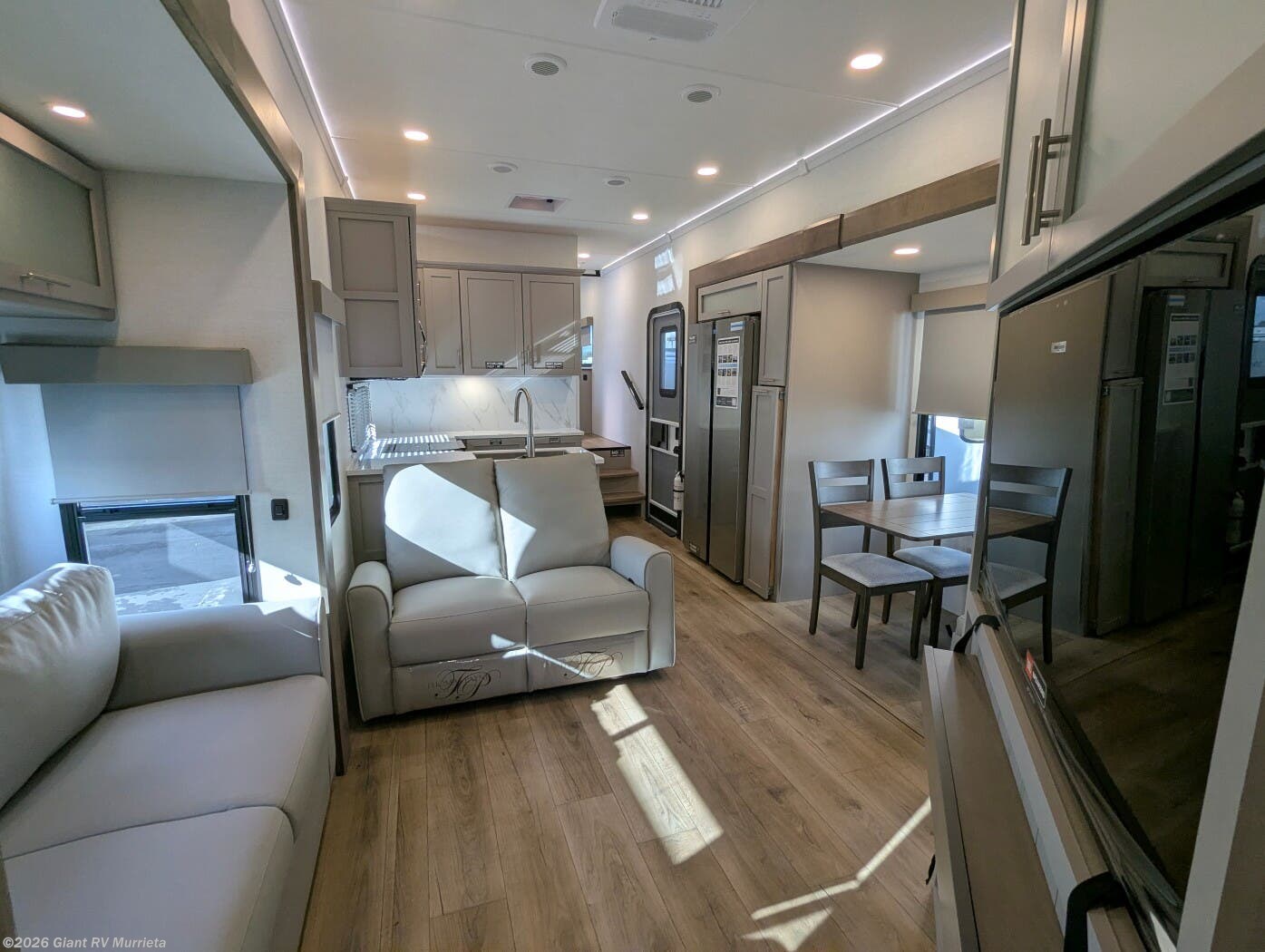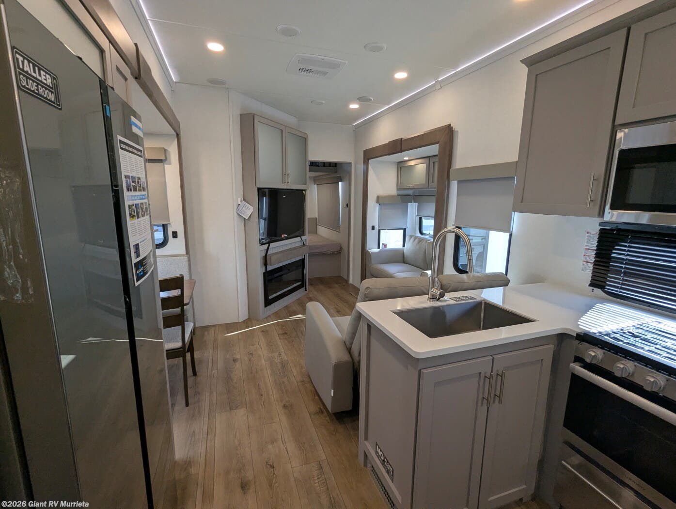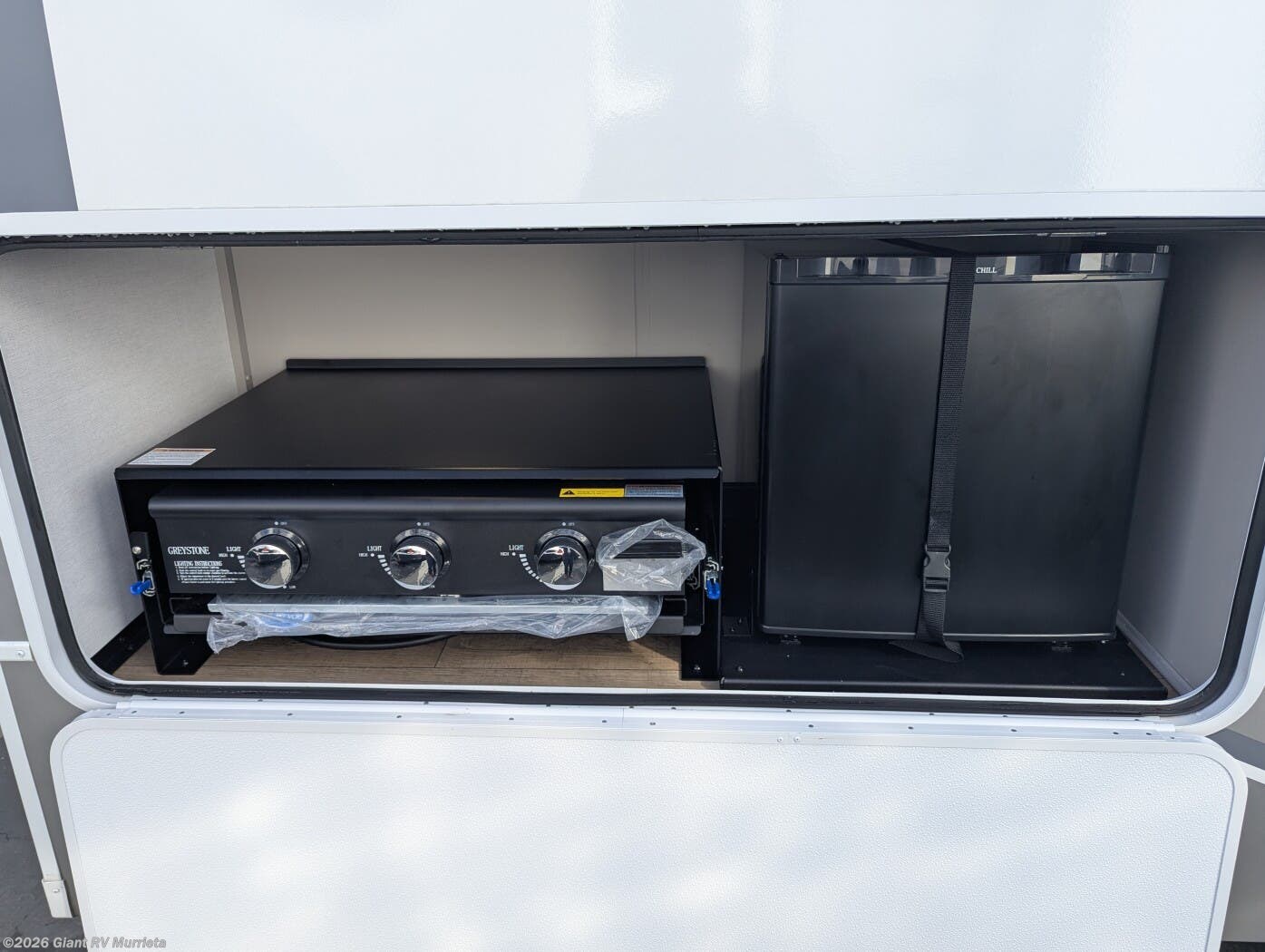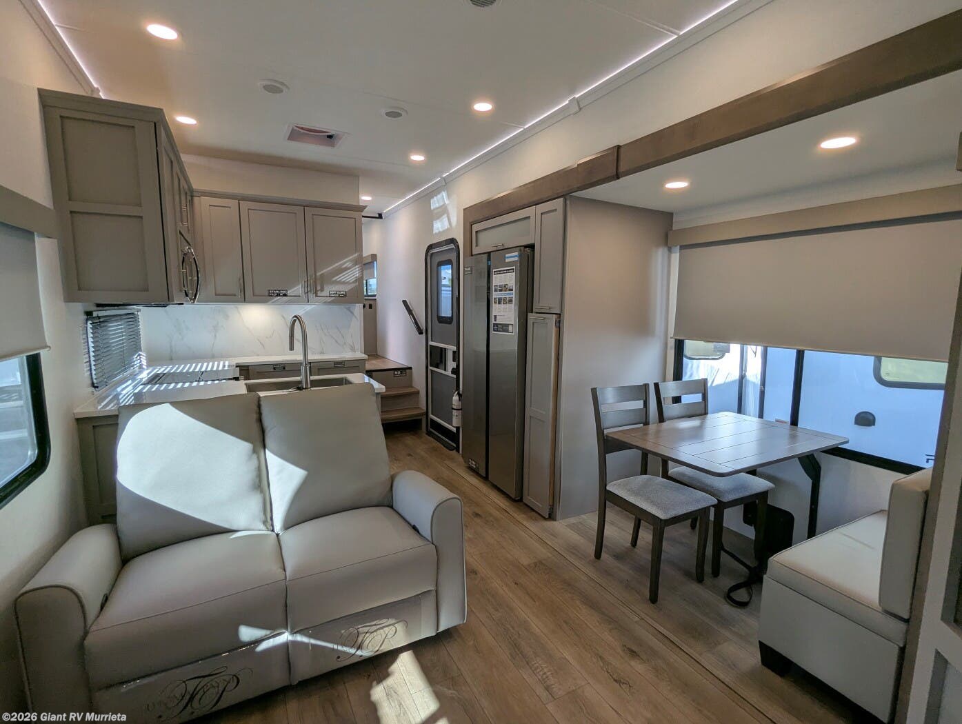 - Outdoor & Utility Features: Complete with an outdoor kitchen (griddle and refrigerator), double entry/exit, hidden storage solutions, and no-carpet flooring for easy maintenance and seamless slideouts.