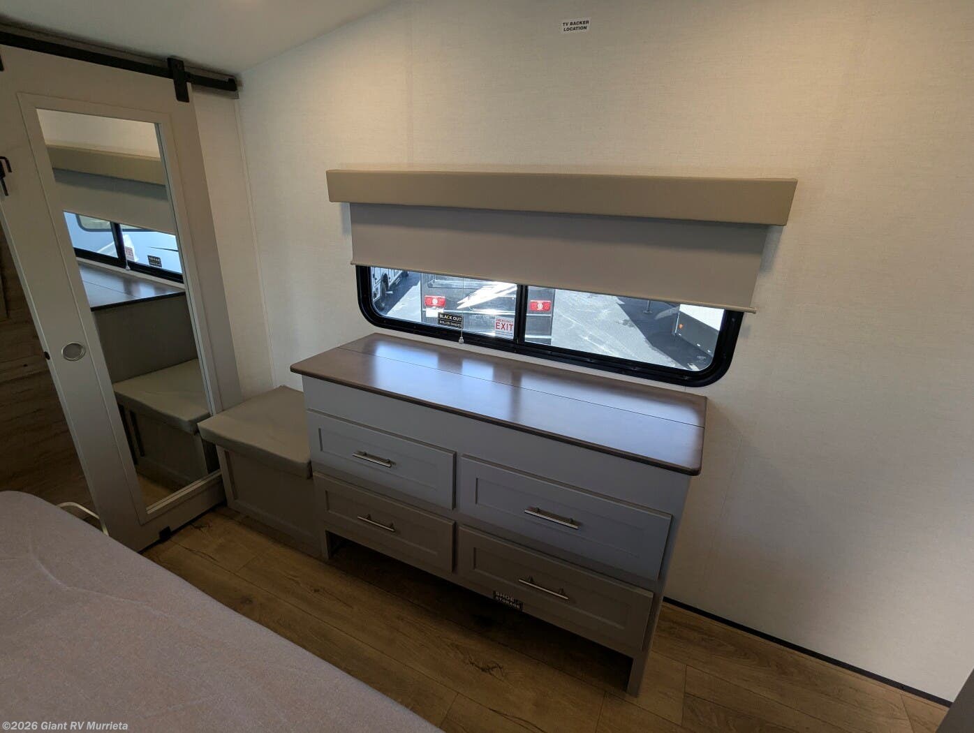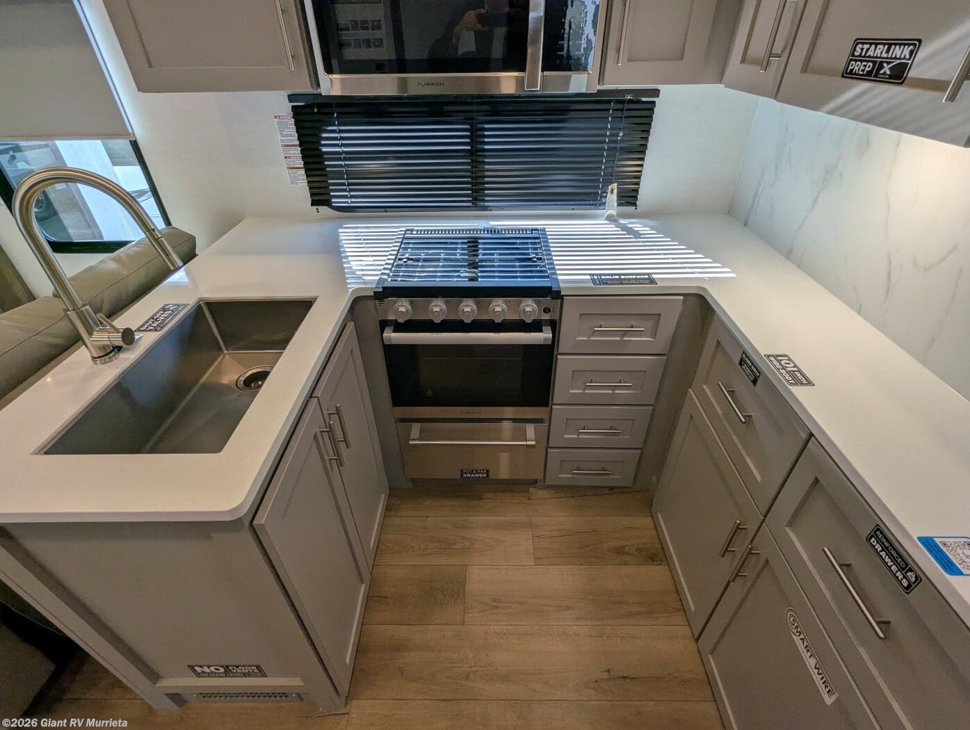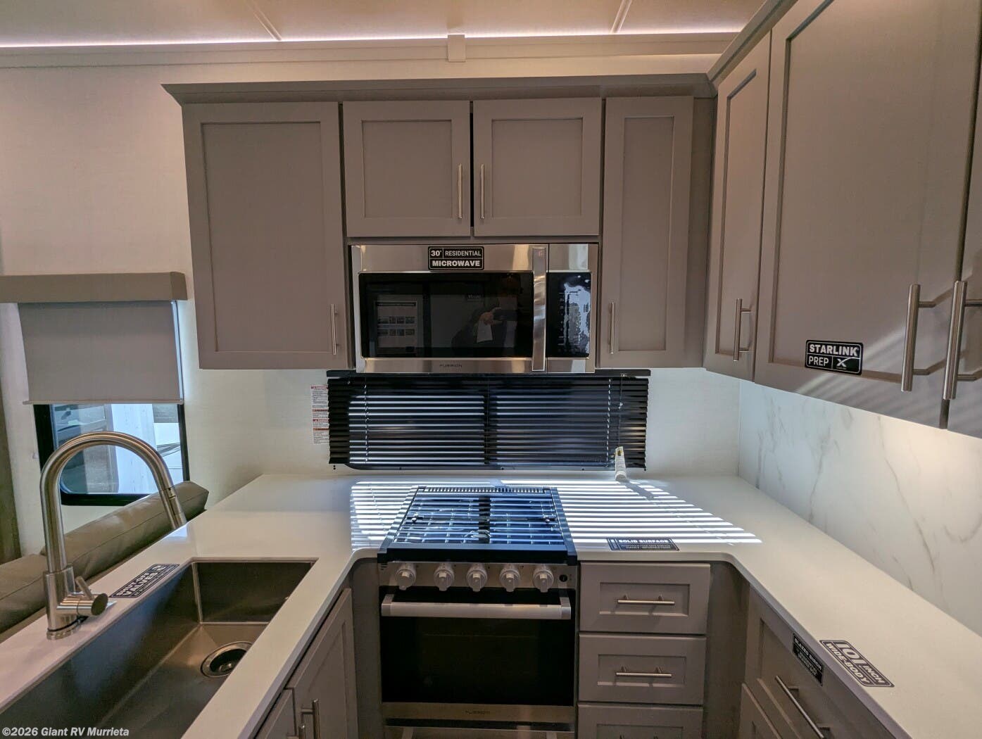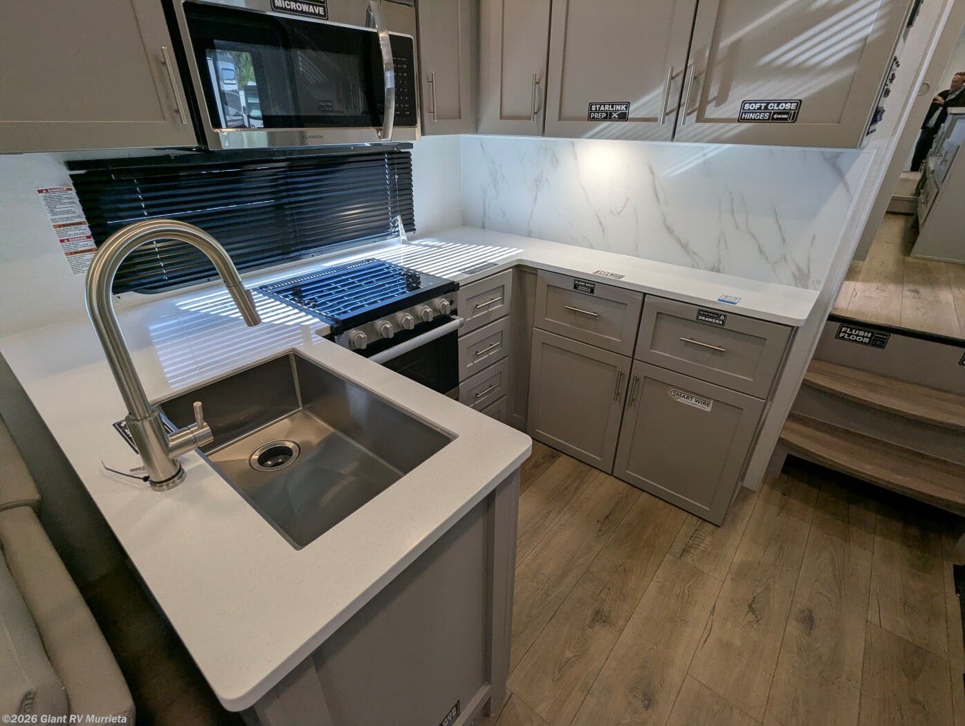 - Outdoor & Utility Features: Complete with an outdoor kitchen (griddle and refrigerator), double entry/exit, hidden storage solutions, and no-carpet flooring for easy maintenance and seamless slideouts.