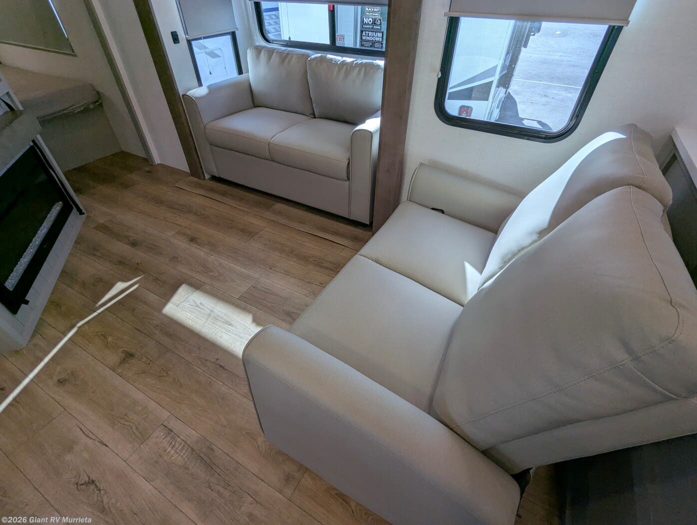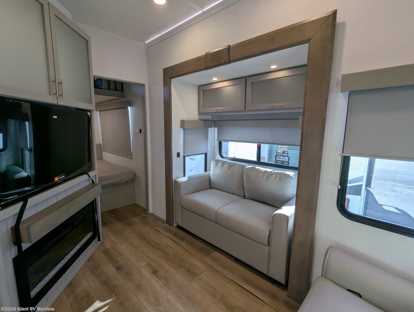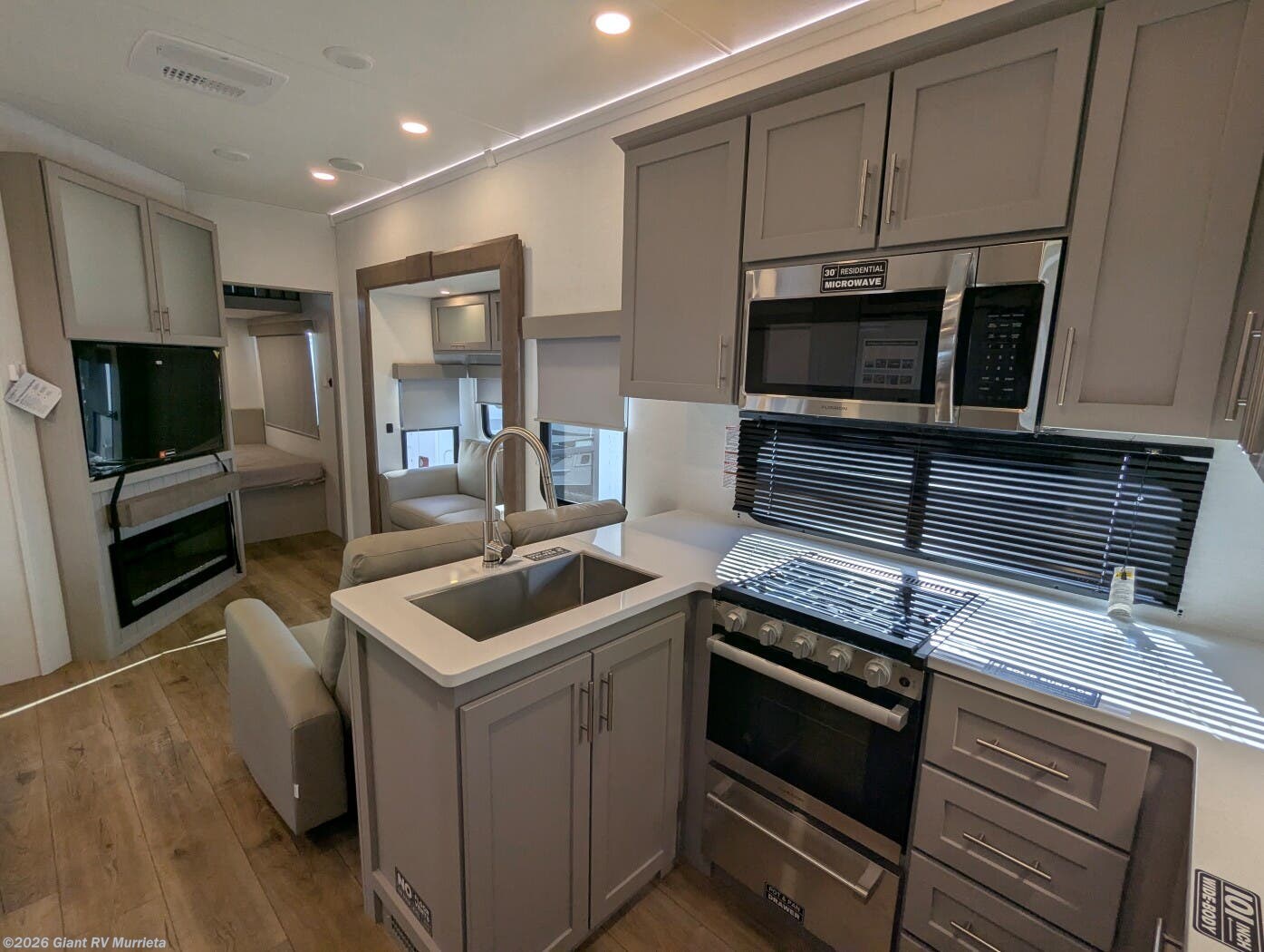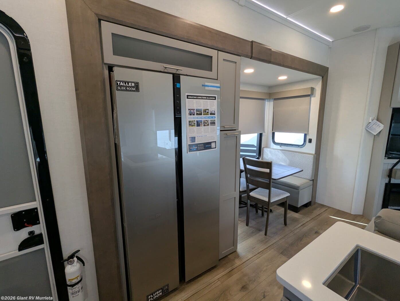 - Open-Concept Living & Kitchen: Enjoy solid surface countertops, residential refrigerator, theater seating, tri-fold sleeper sofa, fireplace, and panoramic windows in the Alliance RV living area for relaxed entertainment.
