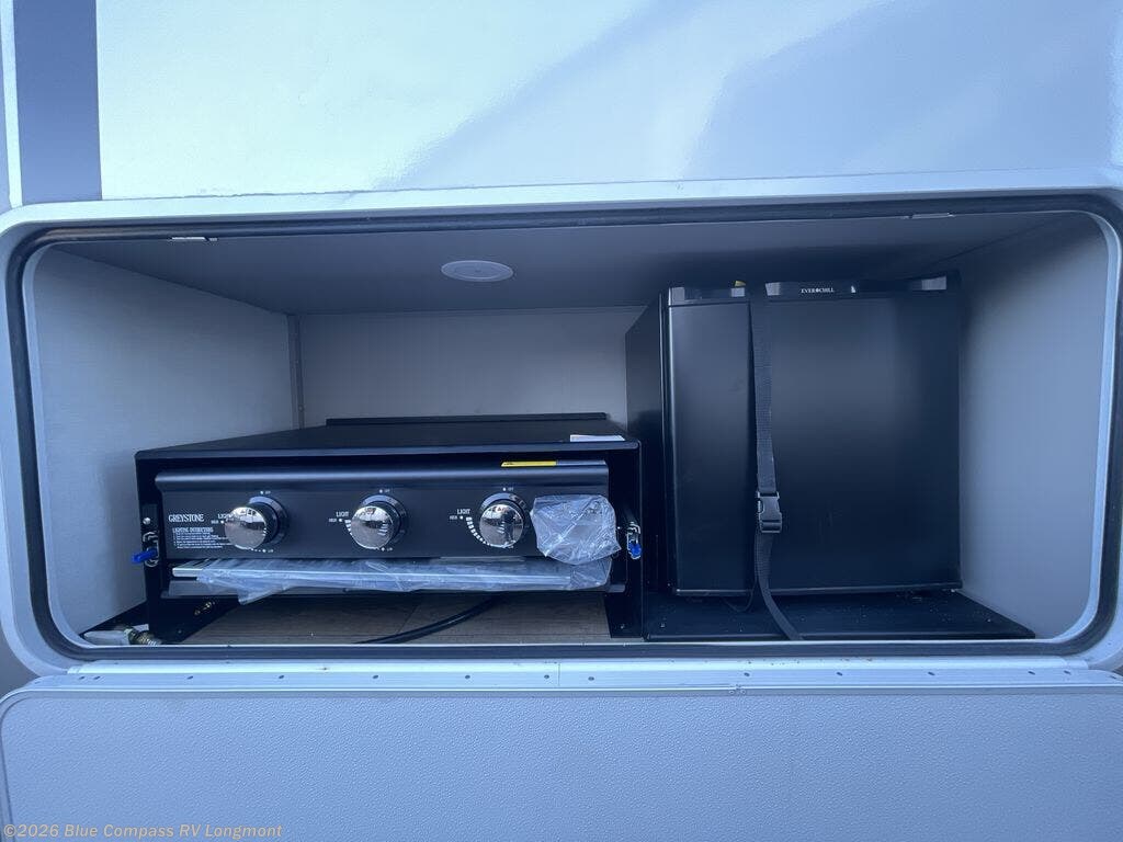 The whole gang can join in on the fun in this fifth wheel! The rear private 54" x 74" loft bed features a lower 60" x 70" bed beneath with storage and a TV, and its very own half bathroom with private entry/exit to the outside. There is also an exterior baggage door so you can easily pack gear straight into this room. The living area comes with dual recliner theater seating, a swing out 50" class HDTV, and a floating dinette table with two chairs and a movable ottoman with flip up storage. There is also a 16 cu. ft. 12 volt refrigerator and pull-out pantry here for food storage. And you can easily prepare your best home cooked meals using the three burner cooktop. When you're ready to wind down your night, head to the front private bedroom and relax on the queen bed slide which could be switched out for the optional king bed if you like! This unit also features an outdoor griddle and refrigerator under the loft space.