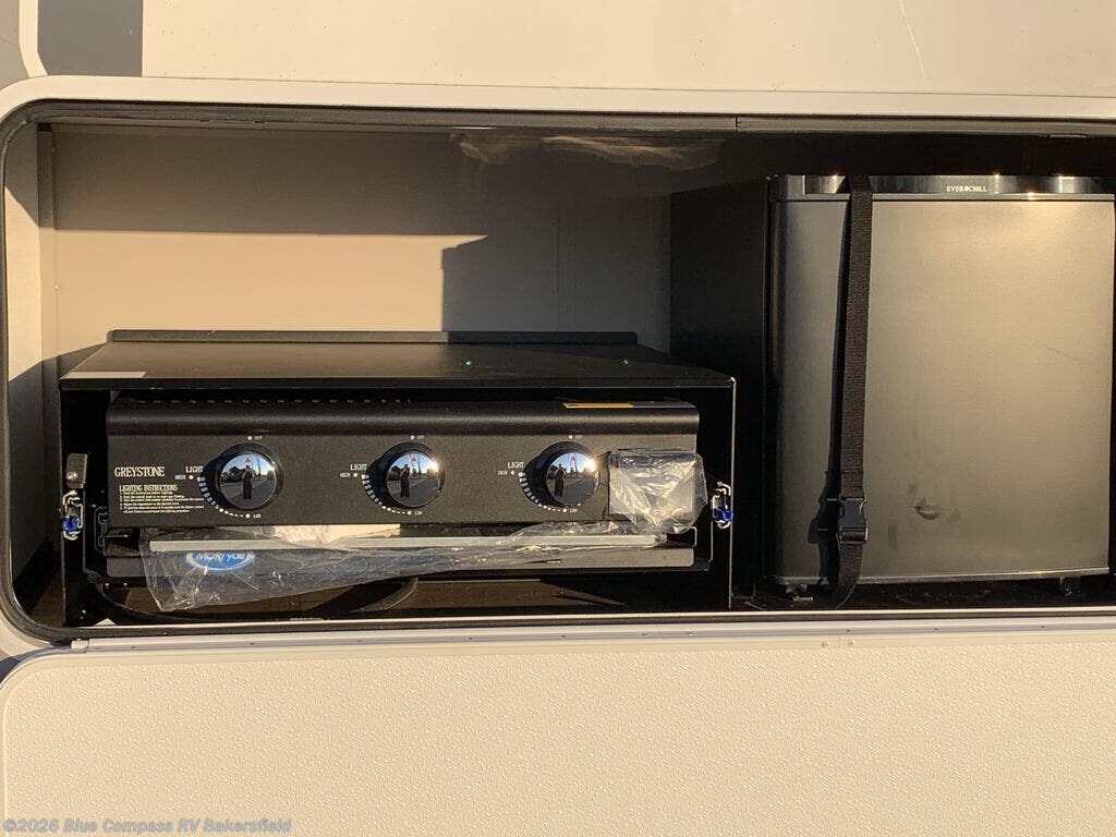 The whole gang can join in on the fun in this fifth wheel! The rear private 54" x 74" loft bed features a lower 60" x 70" bed beneath with storage and a TV, and its very own half bathroom with private entry/exit to the outside. There is also an exterior baggage door so you can easily pack gear straight into this room. The living area comes with dual recliner theater seating, a swing out 50" class HDTV, and a floating dinette table with two chairs and a movable ottoman with flip up storage. There is also a 16 cu. ft. 12 volt refrigerator and pull-out pantry here for food storage. And you can easily prepare your best home cooked meals using the three burner cooktop. When you're ready to wind down your night, head to the front private bedroom and relax on the queen bed slide which could be switched out for the optional king bed if you like! This unit also features an outdoor griddle and refrigerator under the loft space.