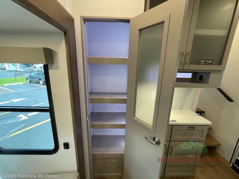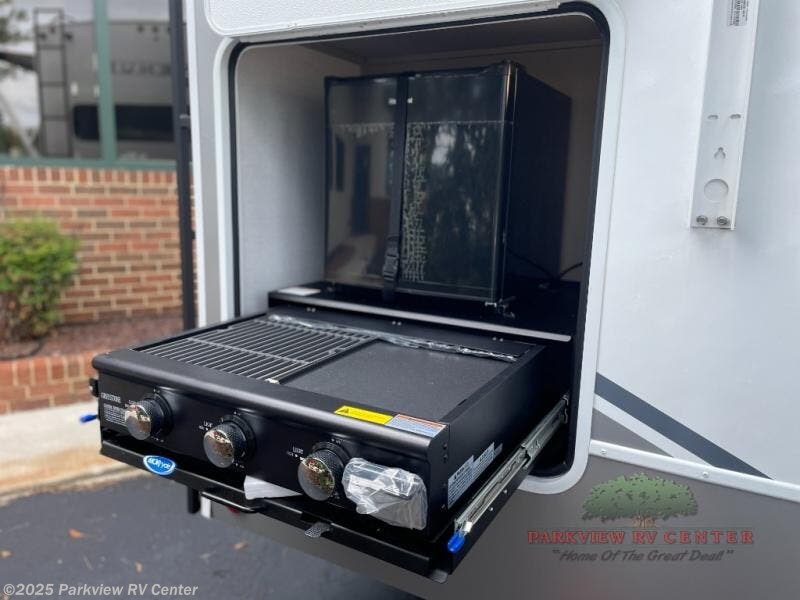 This fifth wheel is ready for adventure when you are! Once you arrive at the campground, you can put out the 16' awning, then start lunch on the exterior griddle. A booth dinette and theater sofa provide seating space inside, and there is a 50" Class HDTV to enjoy movies. The chef will also love the interior kitchen with its ample counter space, and there is plenty of storage with a hutch/pantry, second pantry, and 10 cu. ft. 12V refrigerator. Freshen up in the full bath before heading off to bed in the front private bedroom. Here, you'll find a queen bed, dual nightstands and overhead storage, plus a wardrobe with washer and dryer prep if you choose to add those appliances!