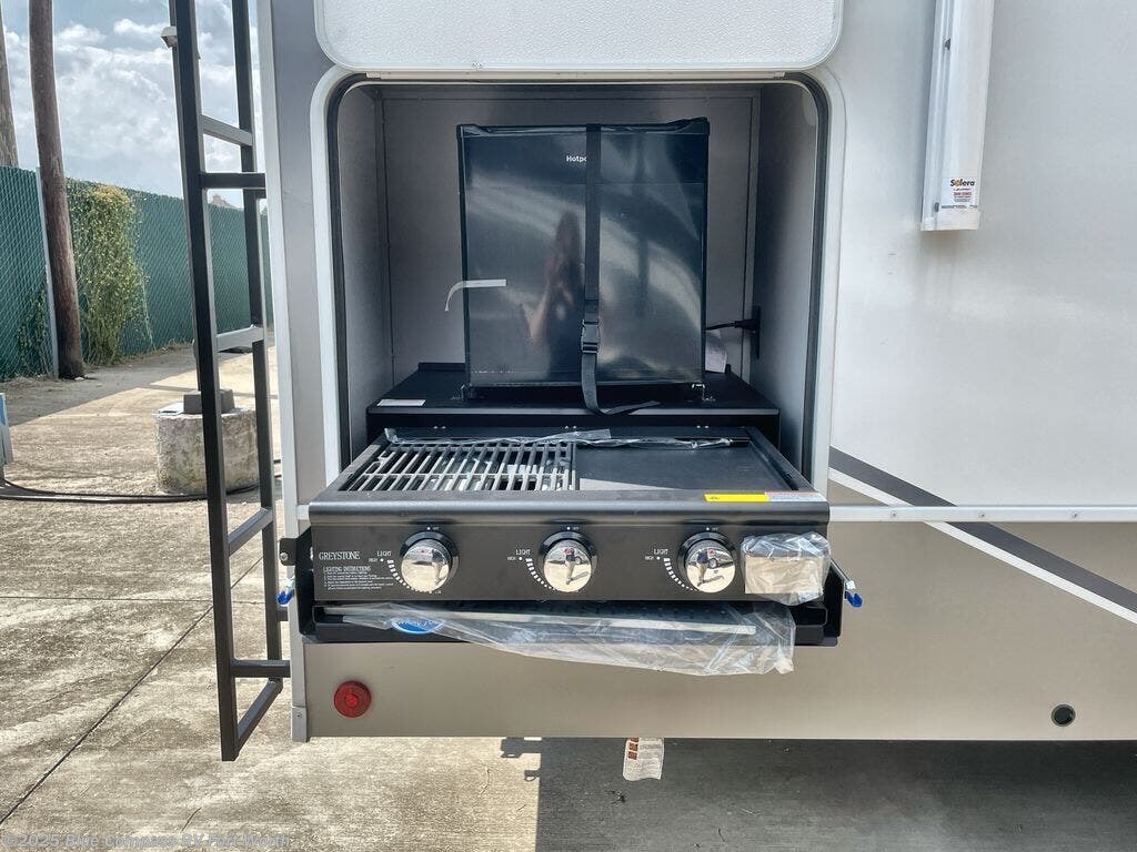 This fifth wheel is ready for adventure when you are! Once you arrive at the campground, you can put out the 16' awning, then start lunch on the exterior griddle. A booth dinette and theater sofa provide seating space inside, and there is a 50" Class HDTV to enjoy movies. The chef will also love the interior kitchen with its ample counter space, and there is plenty of storage with a hutch/pantry, second pantry, and 10 cu. ft. 12V refrigerator. Freshen up in the full bath before heading off to bed in the front private bedroom. Here, you'll find a queen bed, dual nightstands and overhead storage, plus a wardrobe with washer and dryer prep if you choose to add those appliances!