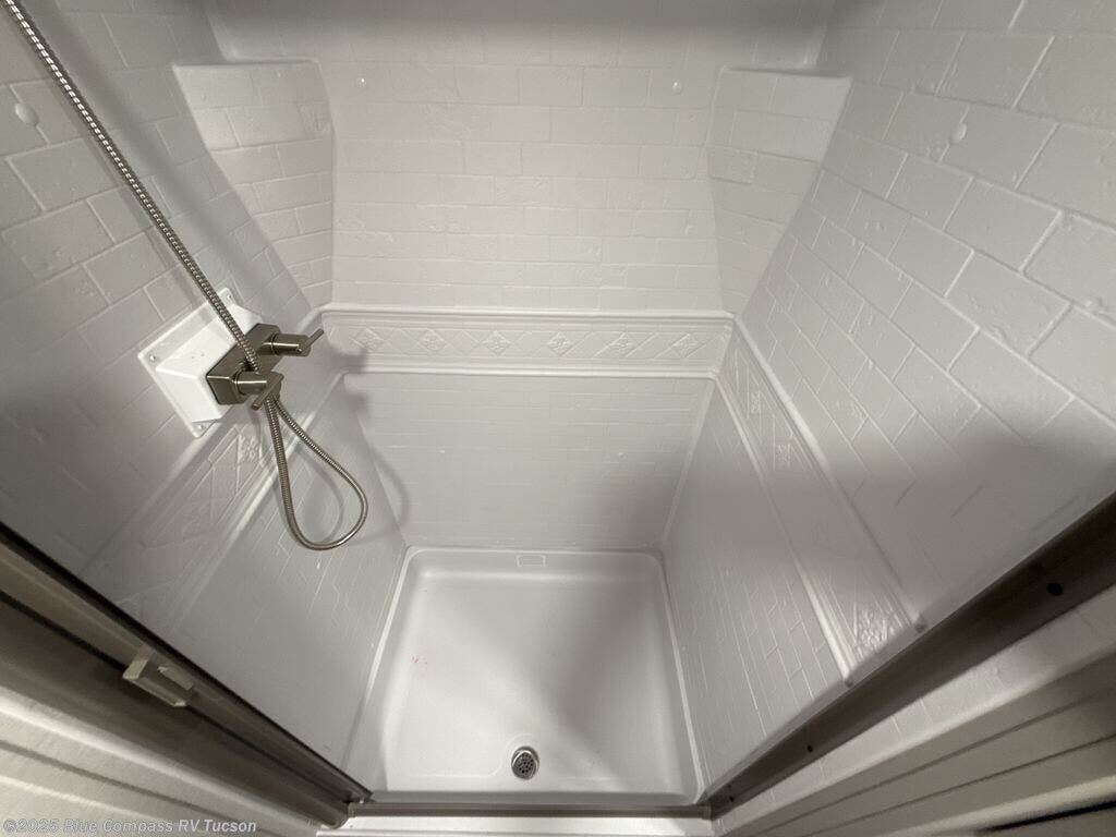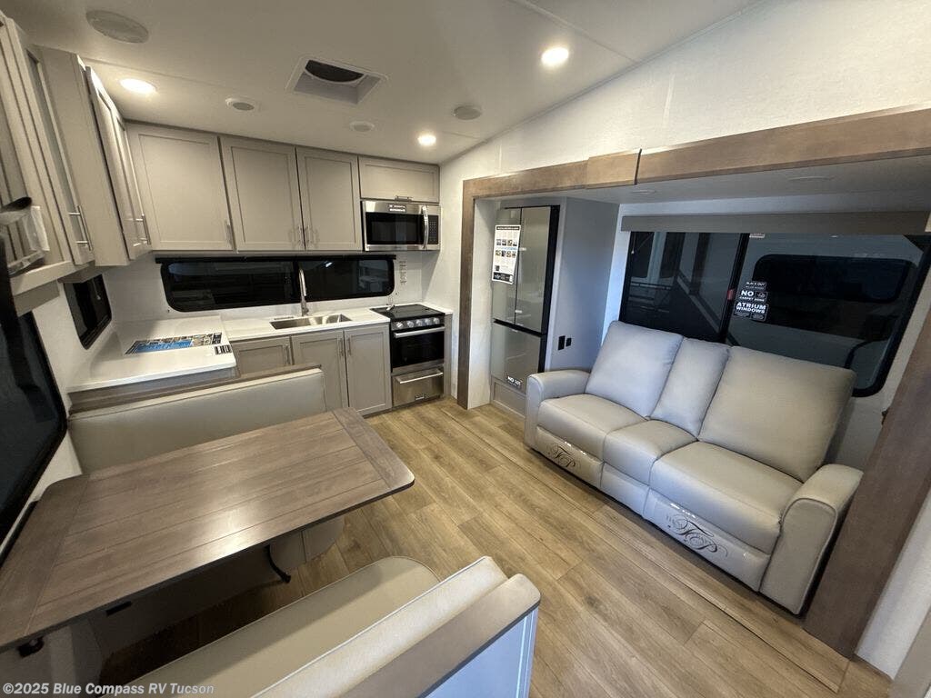 A benchmark chassis creates a space saver upper deck with each one of these Avenue All-Access fifth wheels by Alliance RV! The 101 in. wide-body construction gives you more room to walk around and the flush slide out floors throughout prevent any tripping. There are Azdel composite sidewalls inside and out, and a seamless fully walkable PVC roof for extreme durability and zero maintenance. You are sure to love no carpet throughout making each Avenue All-Access easy to clean and allergen free, not to mention pet friendly. You can maximize your space throughout with innovative storage solutions like the hidden storage behind the TV, inside the end tables, ottoman, and dinette chairs. These units also include the OTG Solar Package with a 200 watt solar panel, 15 amp MPPT charger, multiple outlets, and more to keep you powered up!