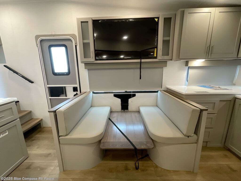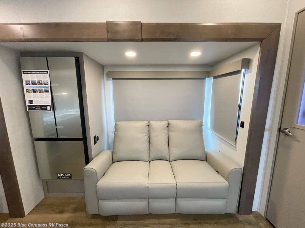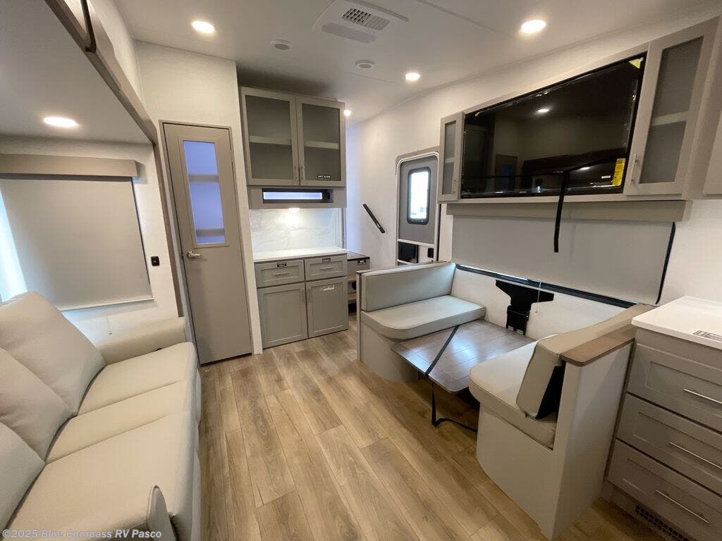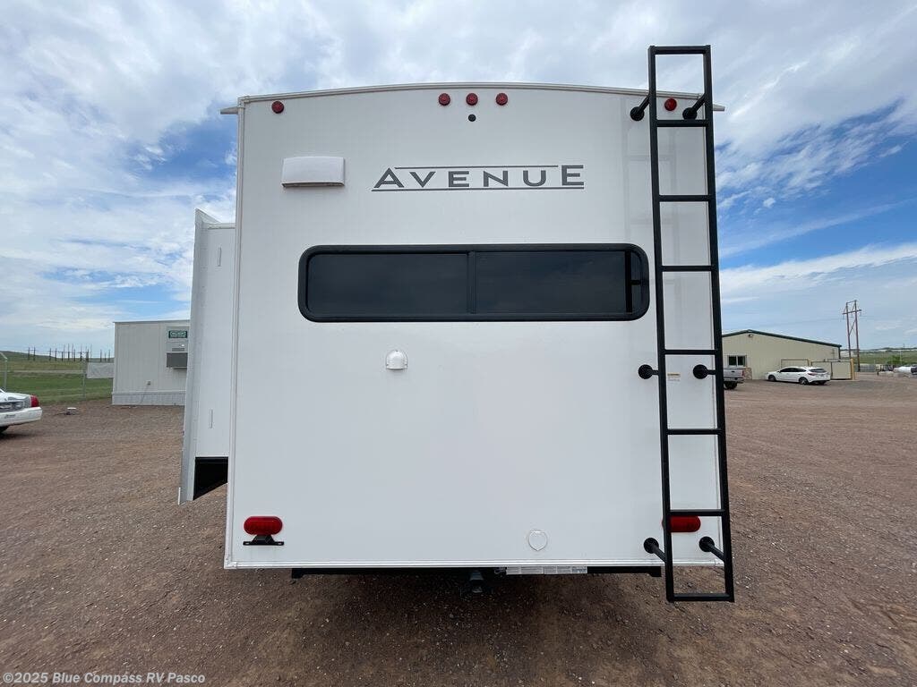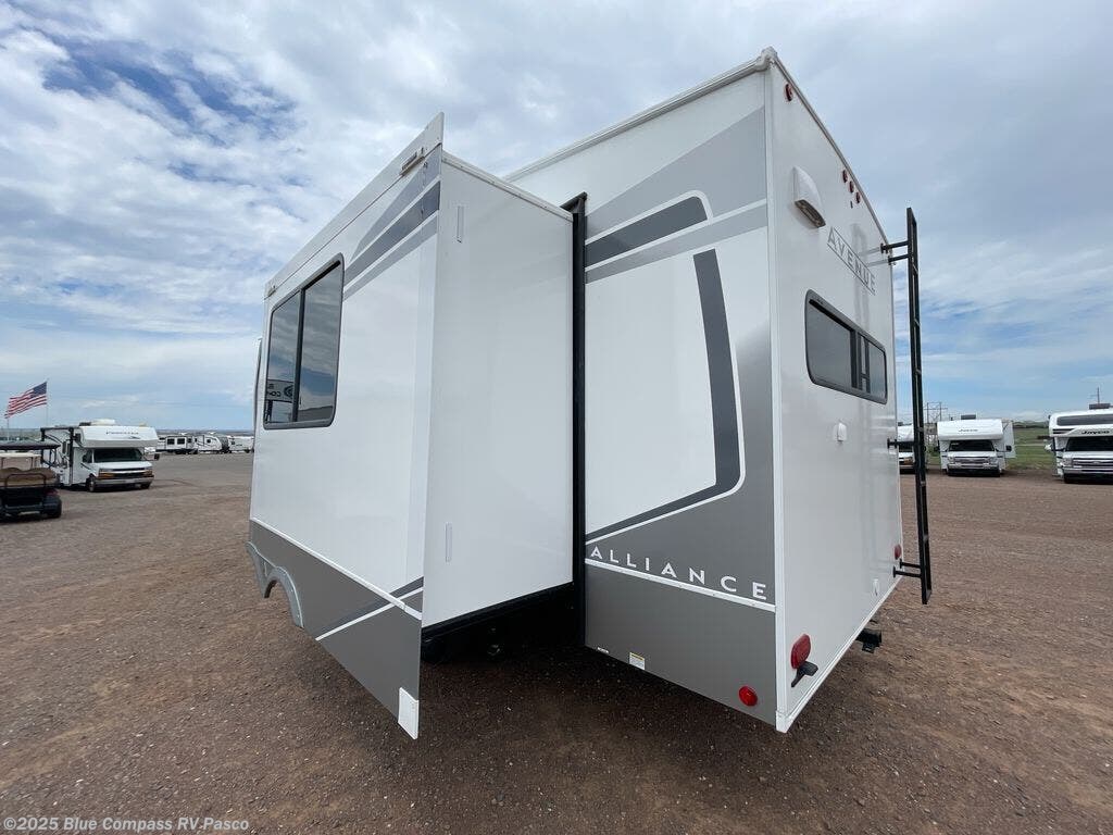 A benchmark chassis creates a space saver upper deck with each one of these Avenue All-Access fifth wheels by Alliance RV! The 101 in. wide-body construction gives you more room to walk around and the flush slide out floors throughout prevent any tripping. There are Azdel composite sidewalls inside and out, and a seamless fully walkable PVC roof for extreme durability and zero maintenance. You are sure to love no carpet throughout making each Avenue All-Access easy to clean and allergen free, not to mention pet friendly. You can maximize your space throughout with innovative storage solutions like the hidden storage behind the TV, inside the end tables, ottoman, and dinette chairs. These units also include the OTG Solar Package with a 200 watt solar panel, 15 amp MPPT charger, multiple outlets, and more to keep you powered up!
