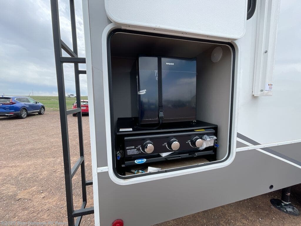 This fifth wheel is ready for adventure when you are! Once you arrive at the campground, you can put out the 16' awning, then start lunch on the exterior griddle. A booth dinette and theater sofa provide seating space inside, and there is a 50" Class HDTV to enjoy movies. The chef will also love the interior kitchen with its ample counter space, and there is plenty of storage with a hutch/pantry, second pantry, and 10 cu. ft. 12V refrigerator. Freshen up in the full bath before heading off to bed in the front private bedroom. Here, you'll find a queen bed, dual nightstands and overhead storage, plus a wardrobe with washer and dryer prep if you choose to add those appliances!