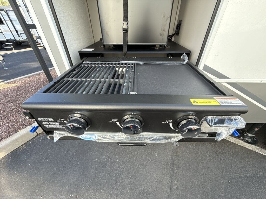 This fifth wheel is ready for adventure when you are! Once you arrive at the campground, you can put out the 16' awning, then start lunch on the exterior griddle. A booth dinette and theater sofa provide seating space inside, and there is a 50" Class HDTV to enjoy movies. The chef will also love the interior kitchen with its ample counter space, and there is plenty of storage with a hutch/pantry, second pantry, and 10 cu. ft. 12V refrigerator. Freshen up in the full bath before heading off to bed in the front private bedroom. Here, you'll find a queen bed, dual nightstands and overhead storage, plus a wardrobe with washer and dryer prep if you choose to add those appliances!
